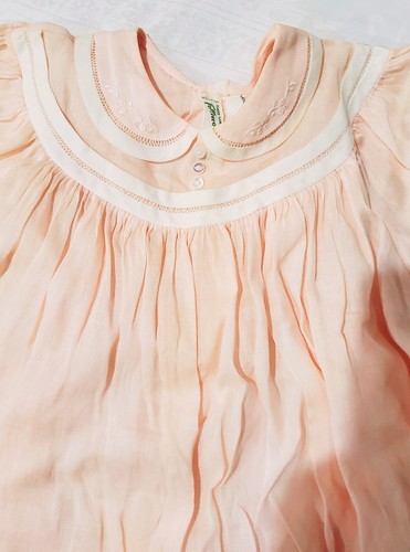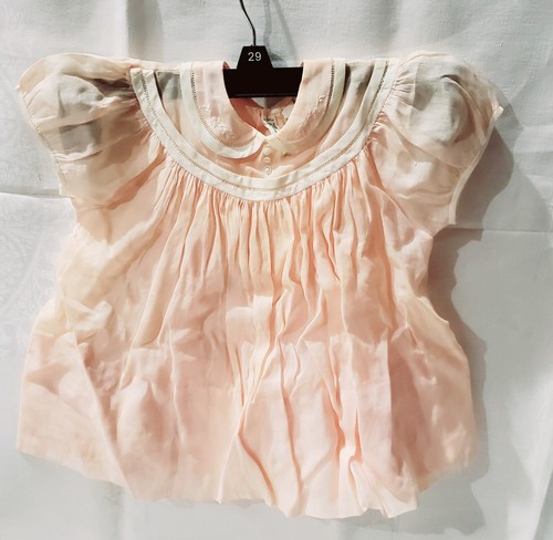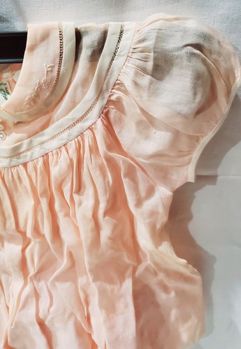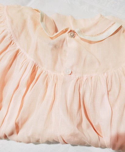 Beautiful vintage, pink, lightweight, baby smock dress. This has a two button closure on the back. This has discoloration and staining throughout that I could not get to show up on the pictures.