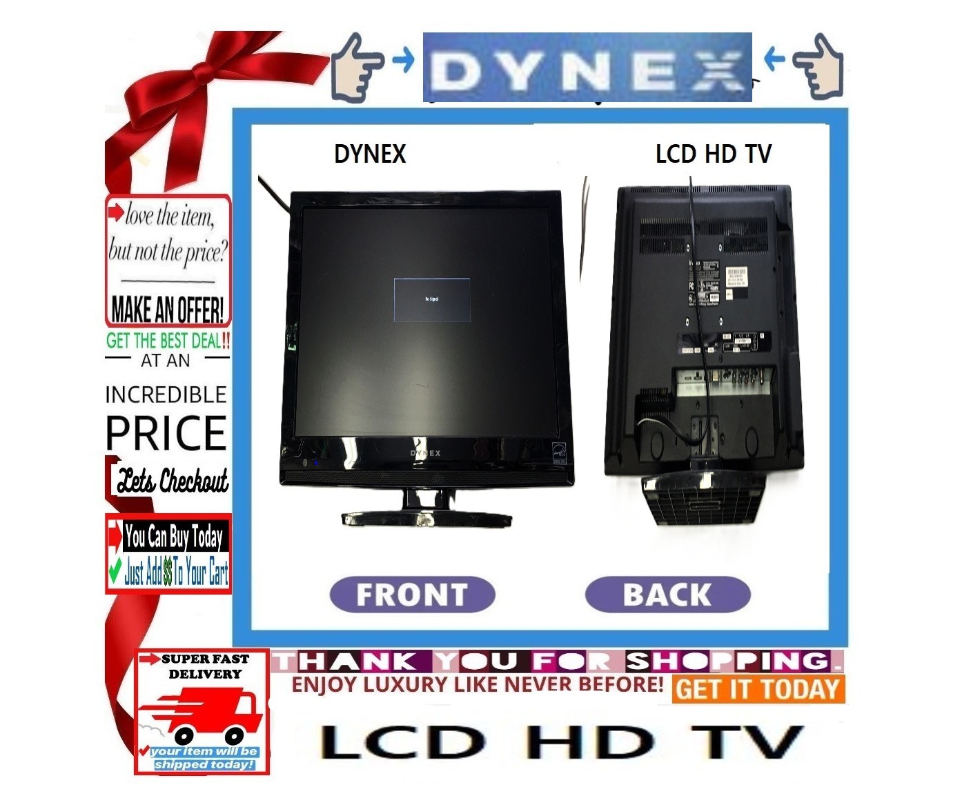 ?S??A??L??E? DYNEX ?? TV MONITOR?BUY NOW??? ?Color: Black?? ?Size: 19 in? ?? DYNEX LCD TV MONITOR ?? ???CONDITION??? ?Pre-Owned GEM??/Gently Used???/Good Condition?? ?UNIT Fully Tested for Functionality Everything Works? ??May Contain Minor Scuffs from Normal Wear Tear? ?Please Refer to Photos for Desc?