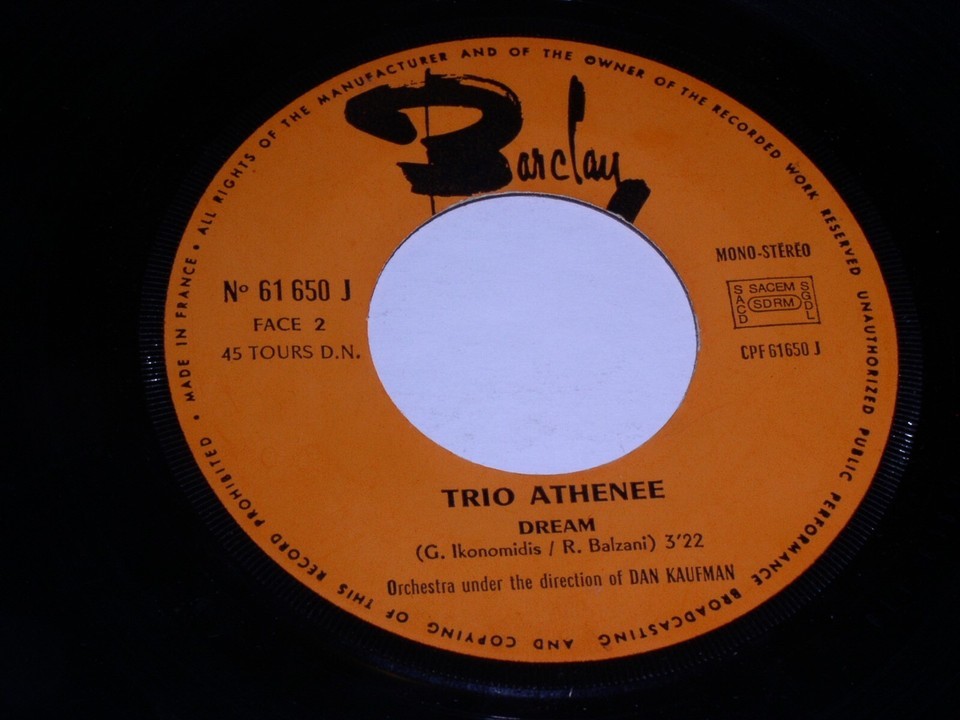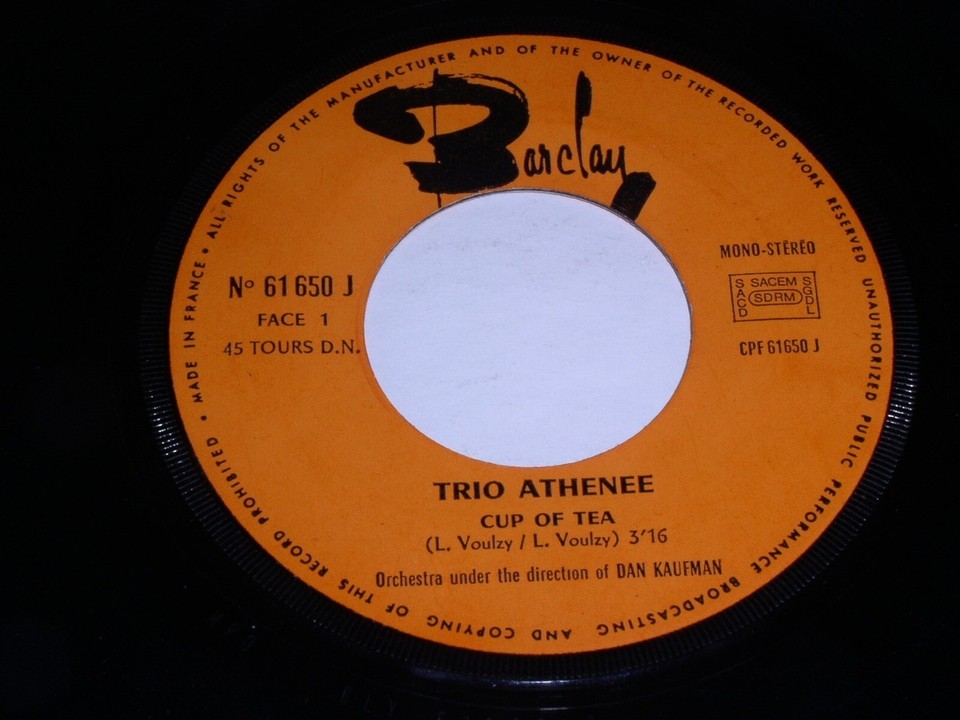 This is the original, vintage France import 45 rpm release of Trio Athenee's, "Cup Of Tea". Flipside: "Dream". Record label Barclay 61650. Comes with picture sleeve as shown.