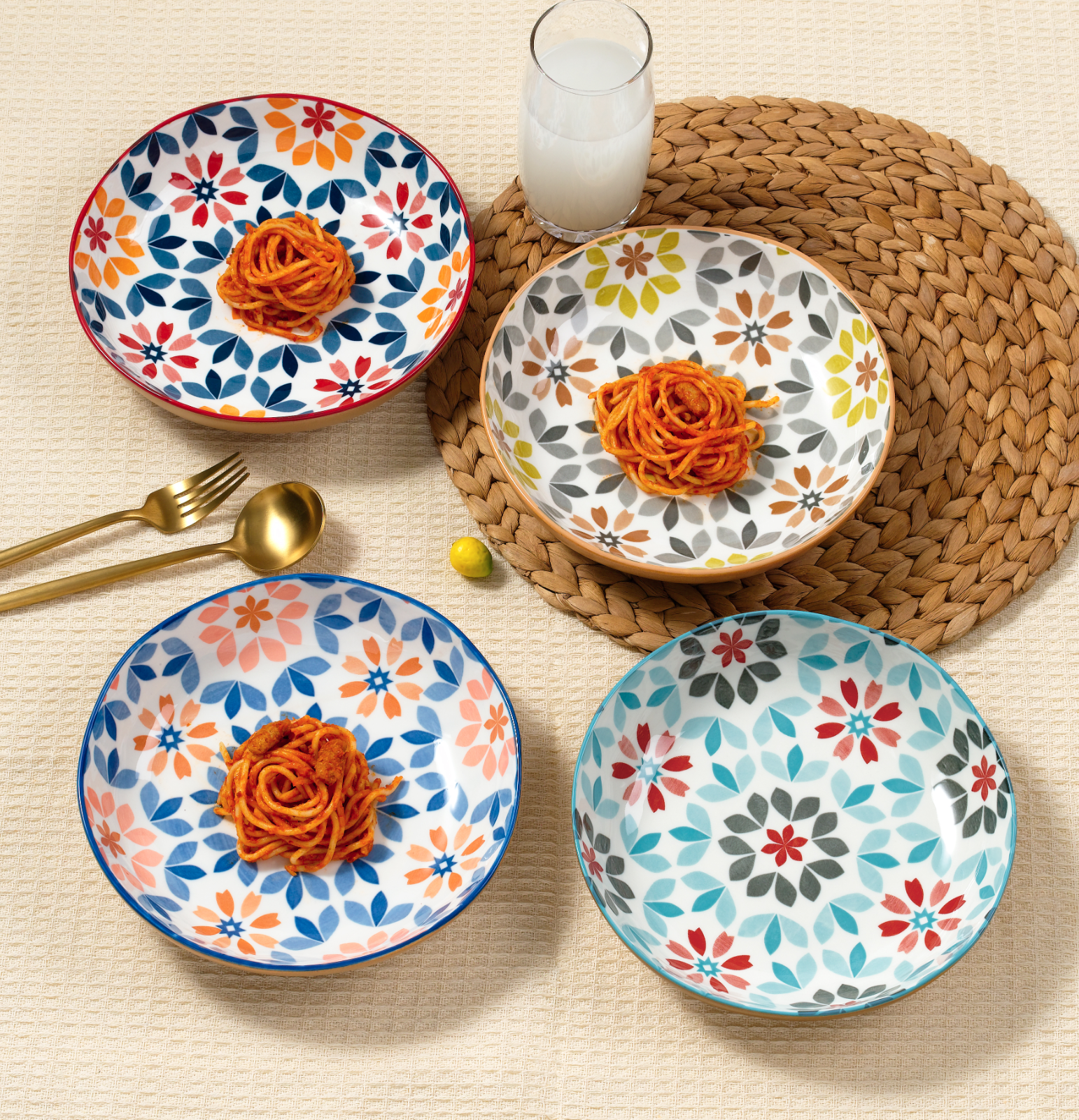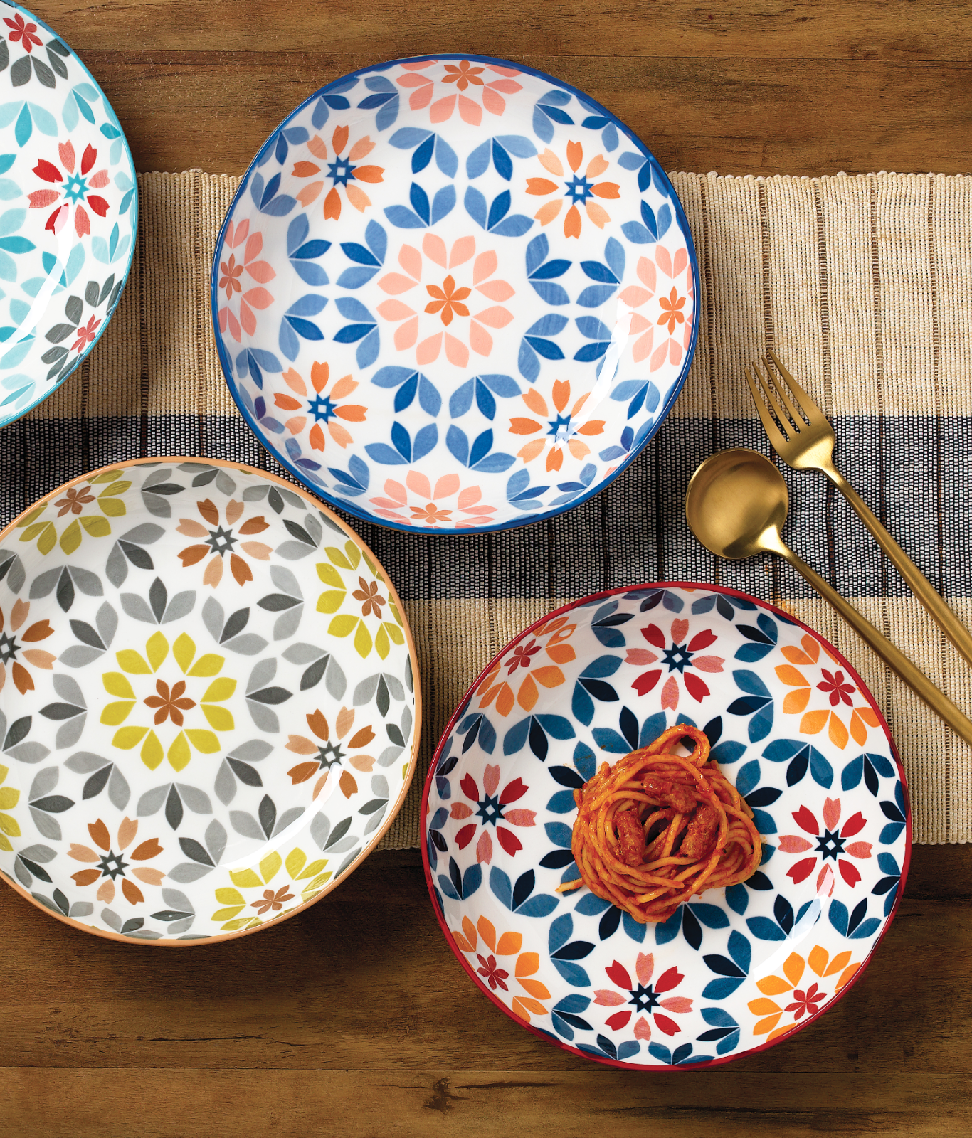 pasta bowls featuring an enchanting floral pattern. Each bowl showcases a
