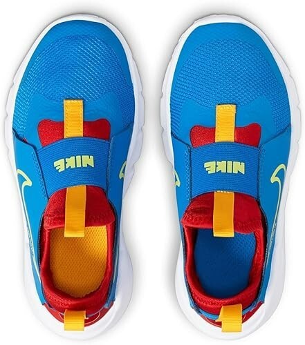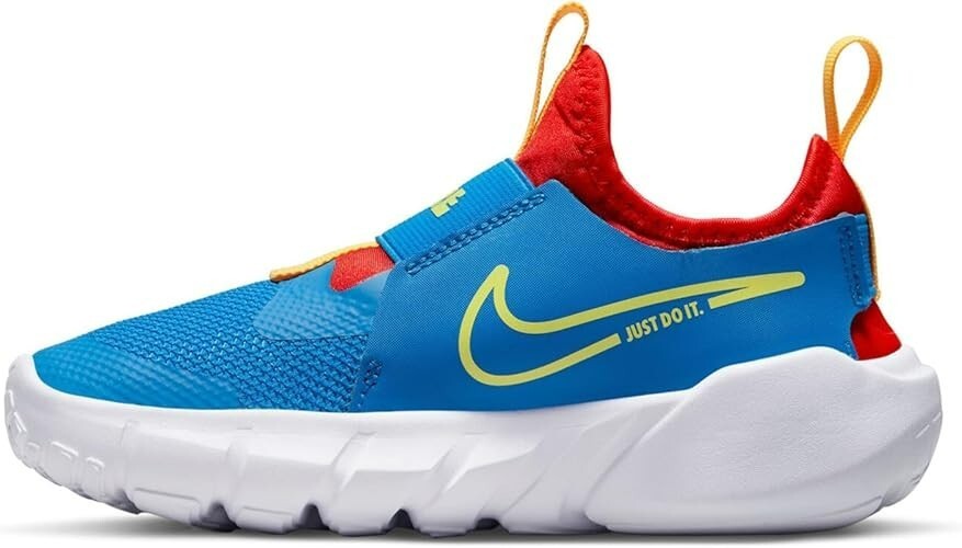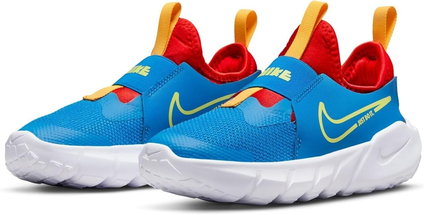 The product is a pair of Nike Flex Runner 2 Low sneakers in a photo blue and atomic green colorway, specifically sized 7Y for boys. These athletic shoes feature a low top style and are made with a durable nylon upper material. They are designed for activities like school and running, offering both style and functionality for young boys on the go. The Nike Flex product line ensures comfort and performance, making them a great choice for active kids.