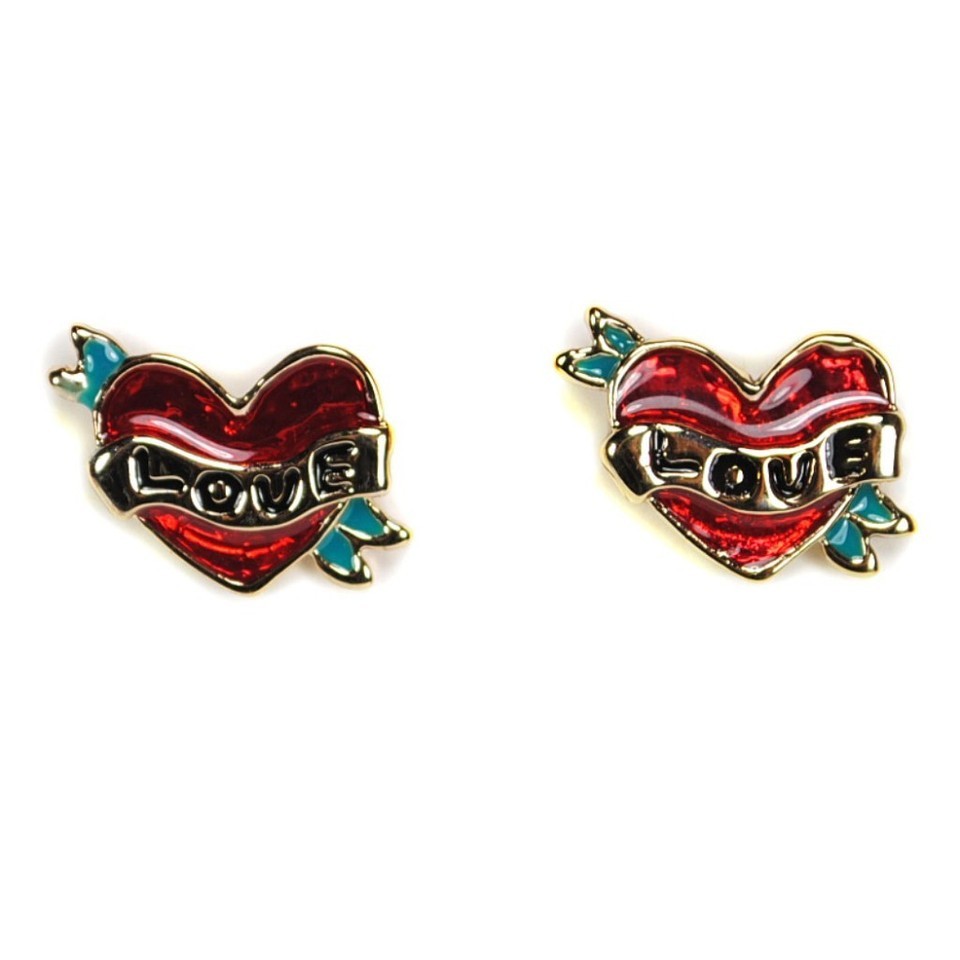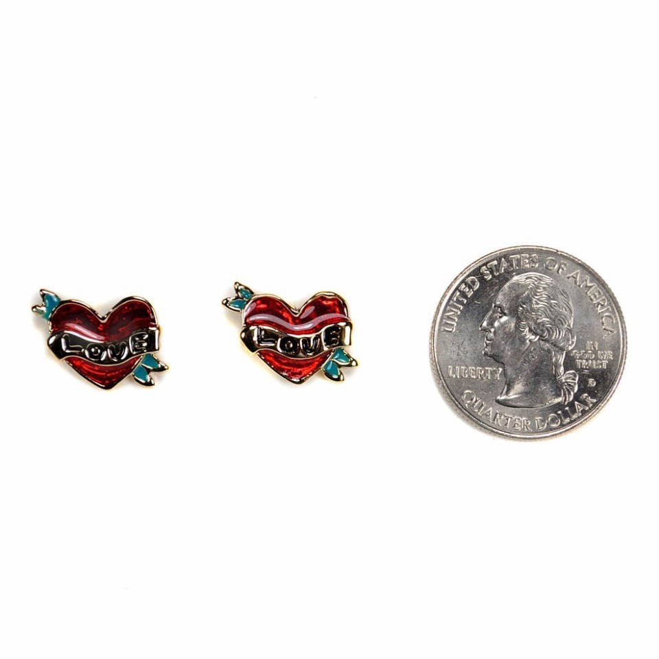 LOVE HEART EARRINGS Classic Tattoo Style Valentines Day Stud Post Gold Enamel