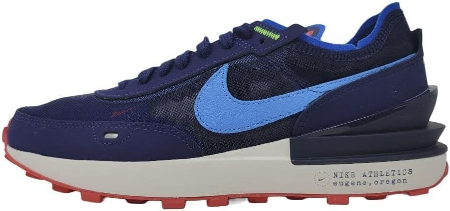 The product is a Nike Waffle One SE sneaker in a blackened blue and university blue colorway, released in 2022. This athletic shoe is designed for men in a size 12 with a mesh upper material and a medium shoe width. The Nike Waffle One SE features a stylish design and is part of the Nike Waffle product line, known for its comfort and performance. Perfect for men looking for a sleek and sporty shoe option.