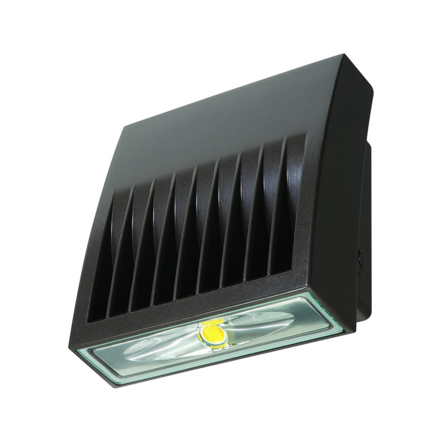 Specifications Watts: 18 watt Light Source: LED Product Type: Wall Pack Volts: 277 volt Hardwired or Plug In: Hardwired Height: 3.62 in. Width: 6.75 in. Lumens: 1418 lumens Casing Material: Aluminum Color: Bronze Length: 5.75 in. Weight: 3.6 lbs
