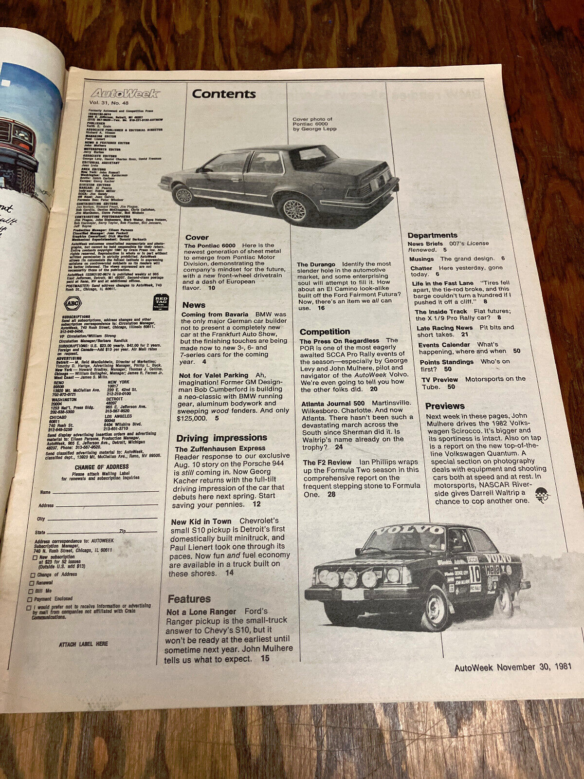 AutoWeek magazine Pontiac premiers its fleet front driver for 82 issue Nov 1981
