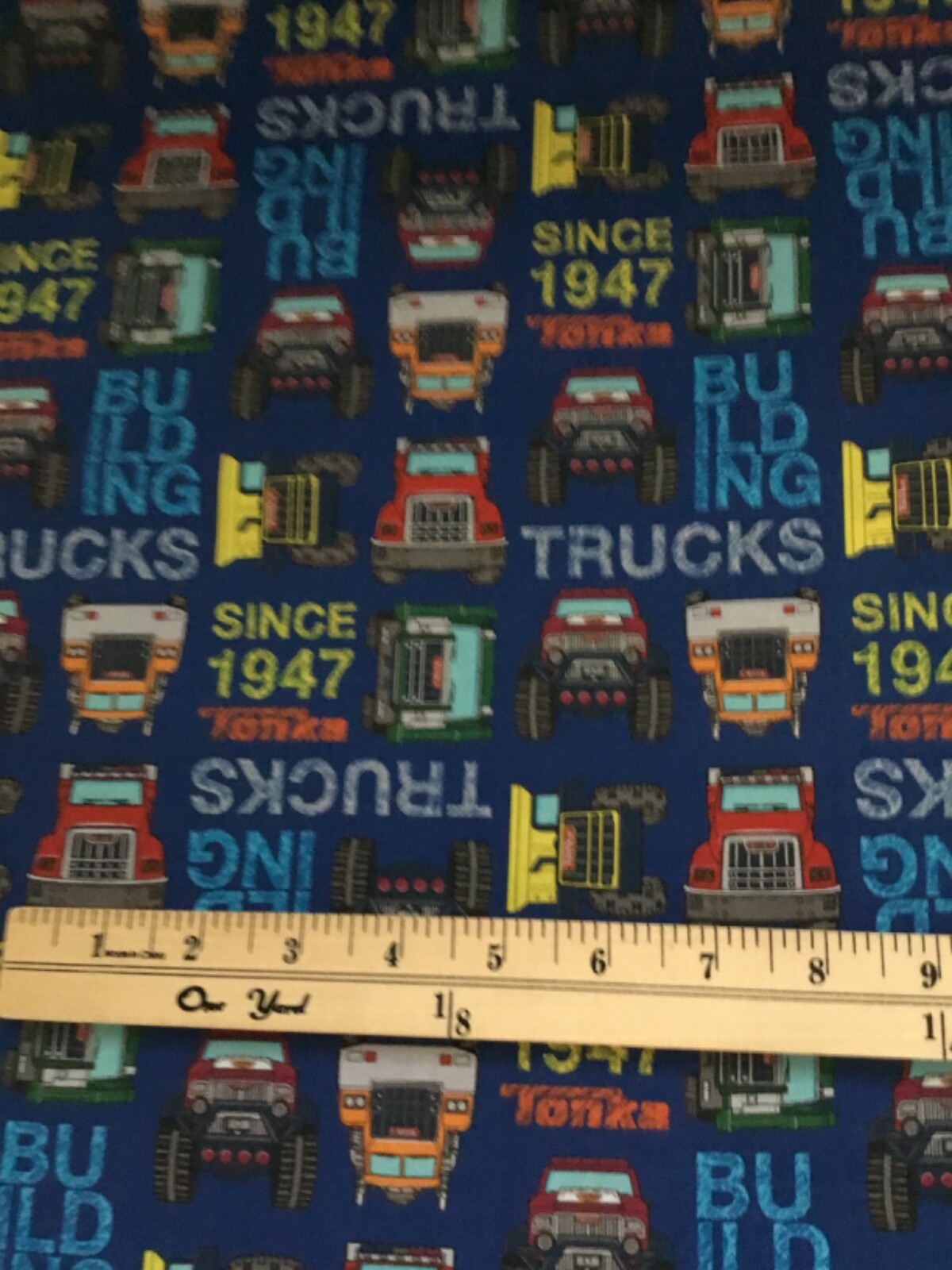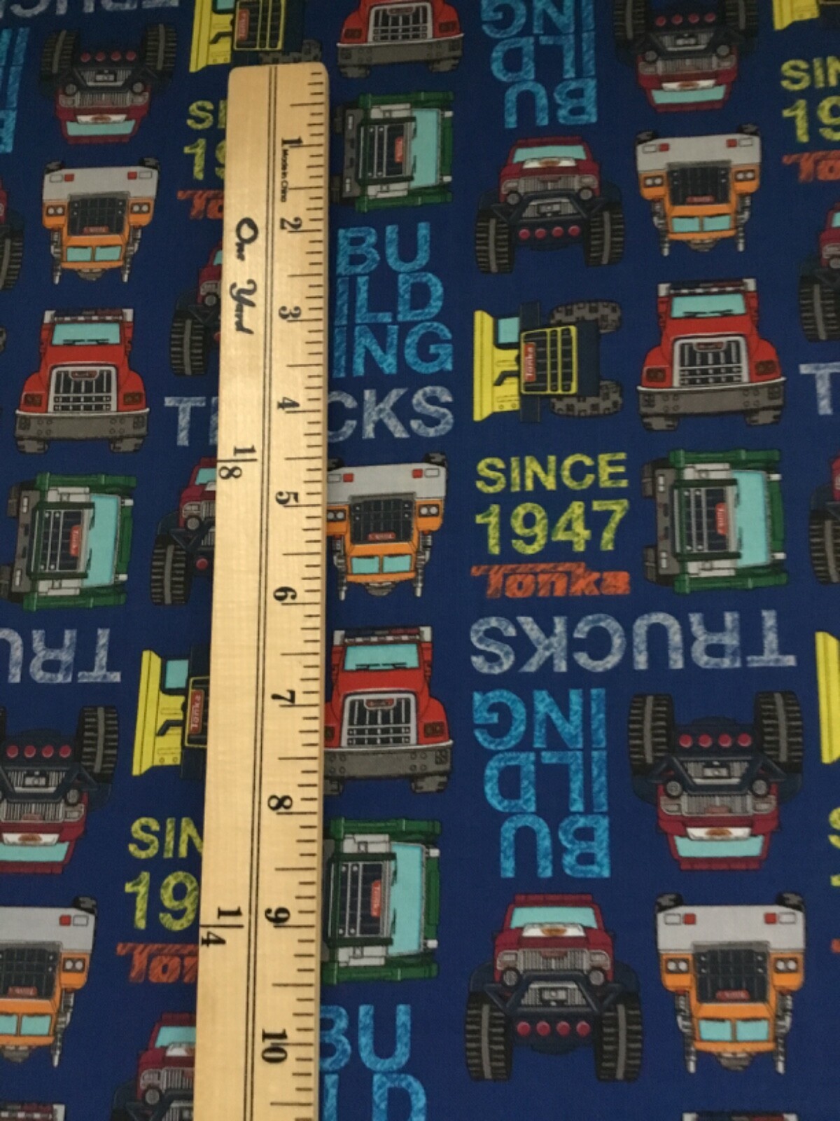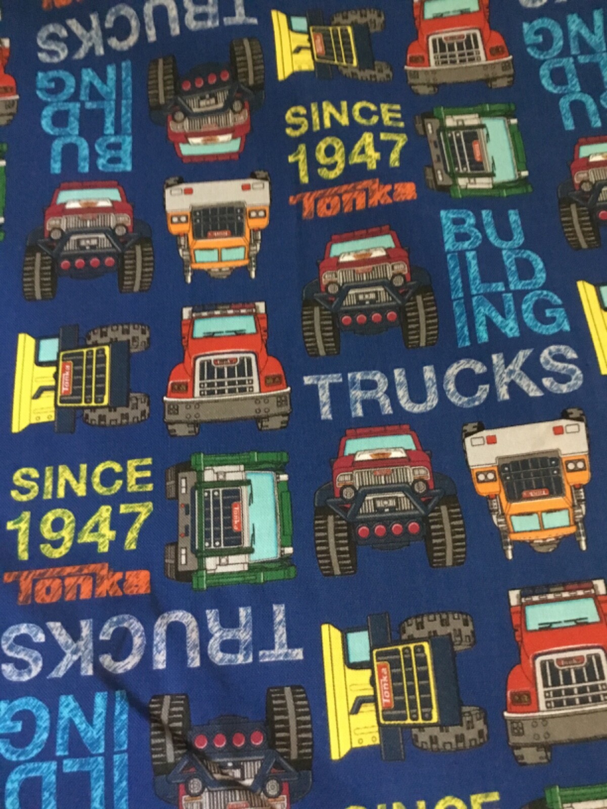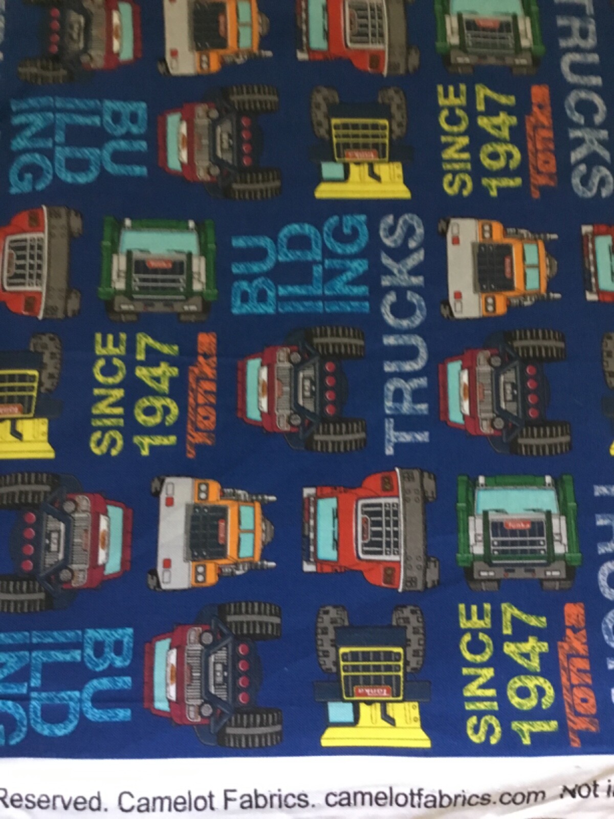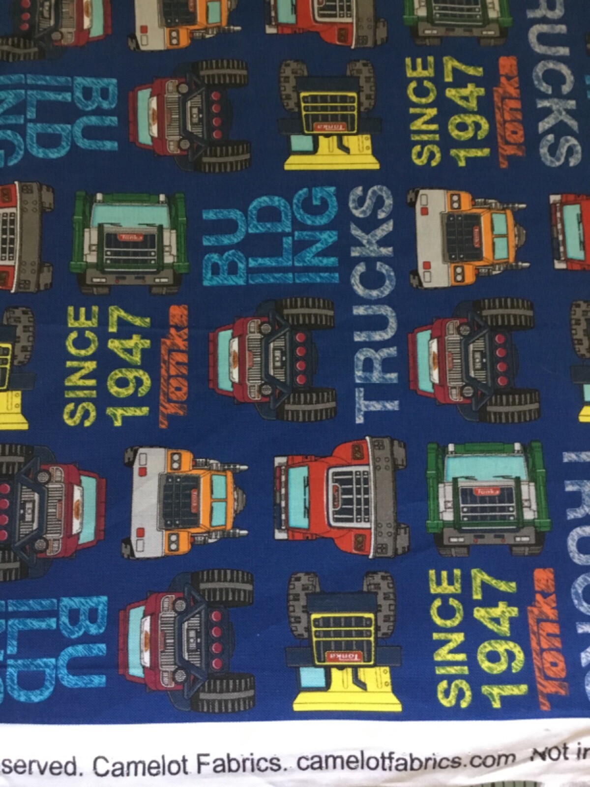 Camelot Fabrics - Tonka Trucks Toss 100% Cotton on Blue by the 1/2 yard