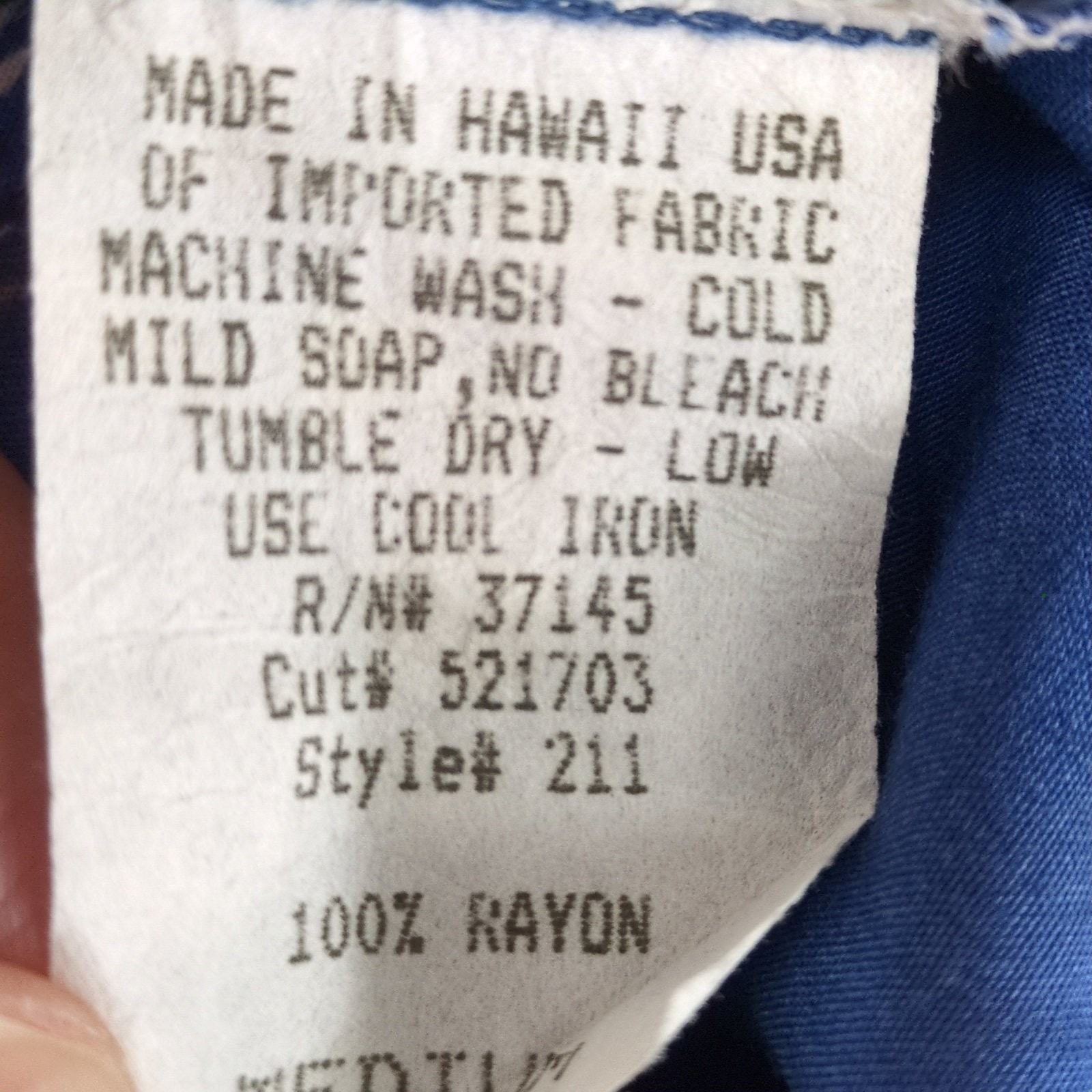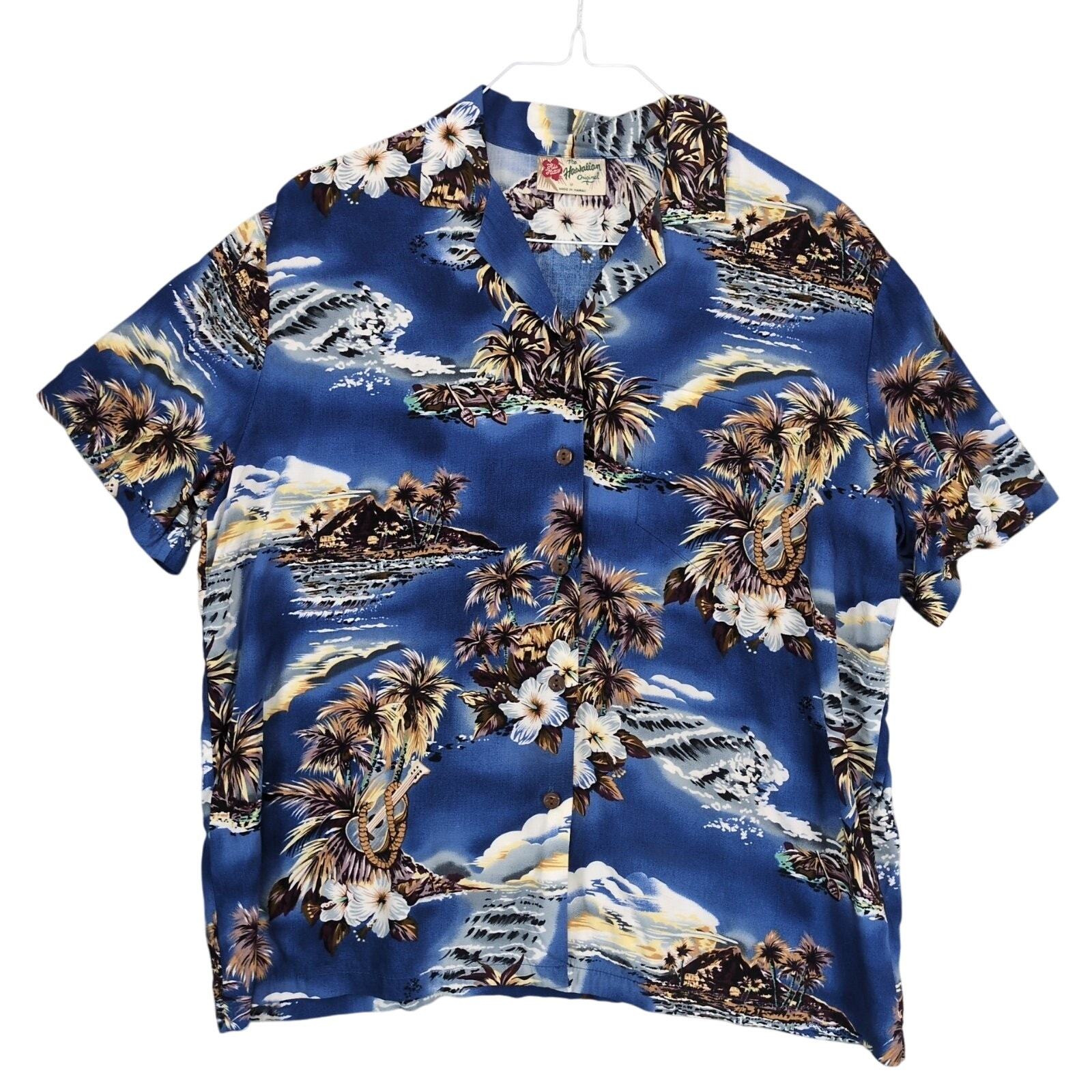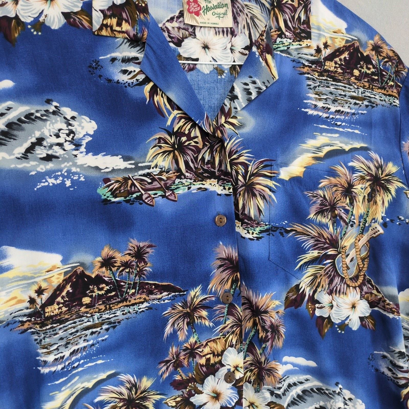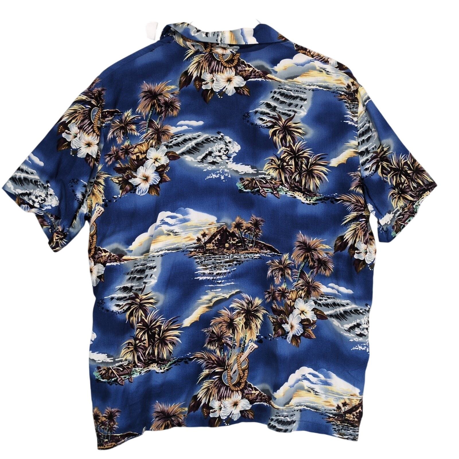 * Features: Tropical Hawaiian print in blue with islands, palm trees, waves, leis and ukuleles. Coconut husk buttons, single pocket, short sleeves, collared neck, flowy rayon fabric, made in Hawaii USA.