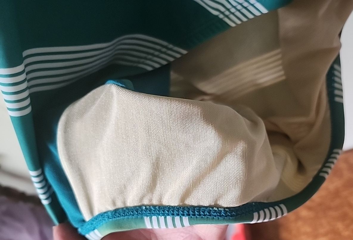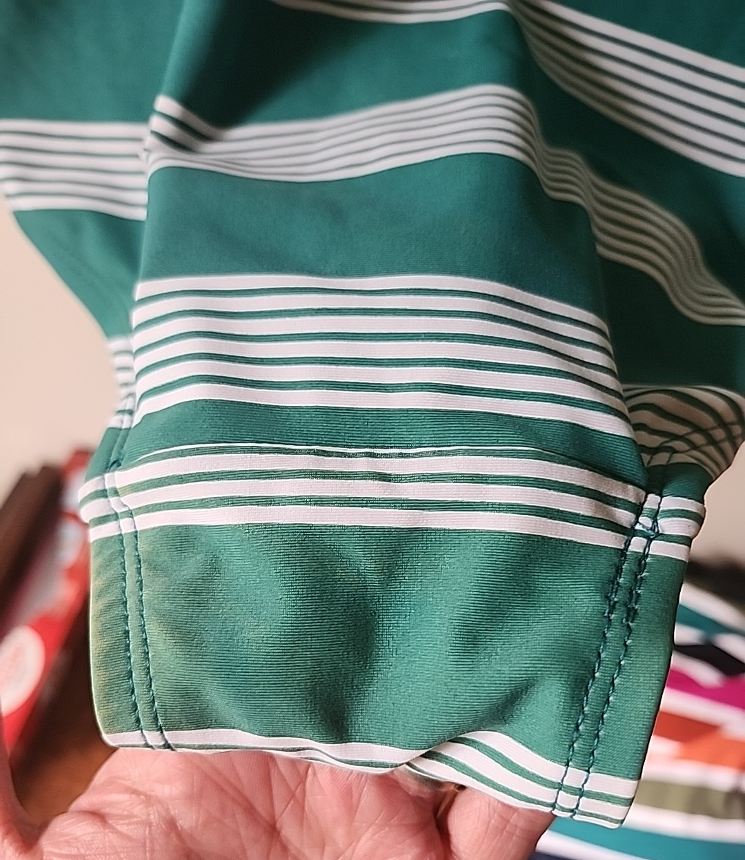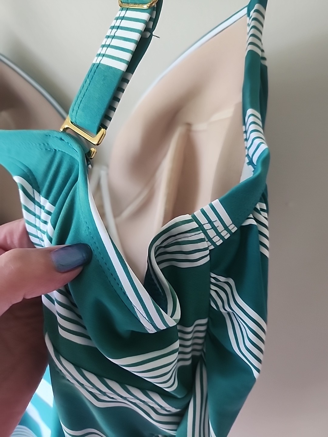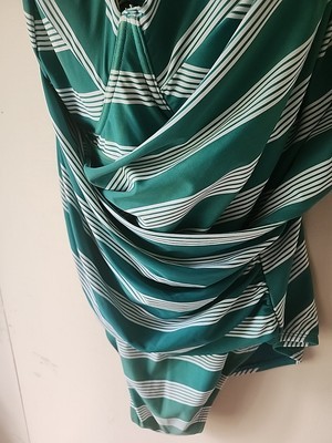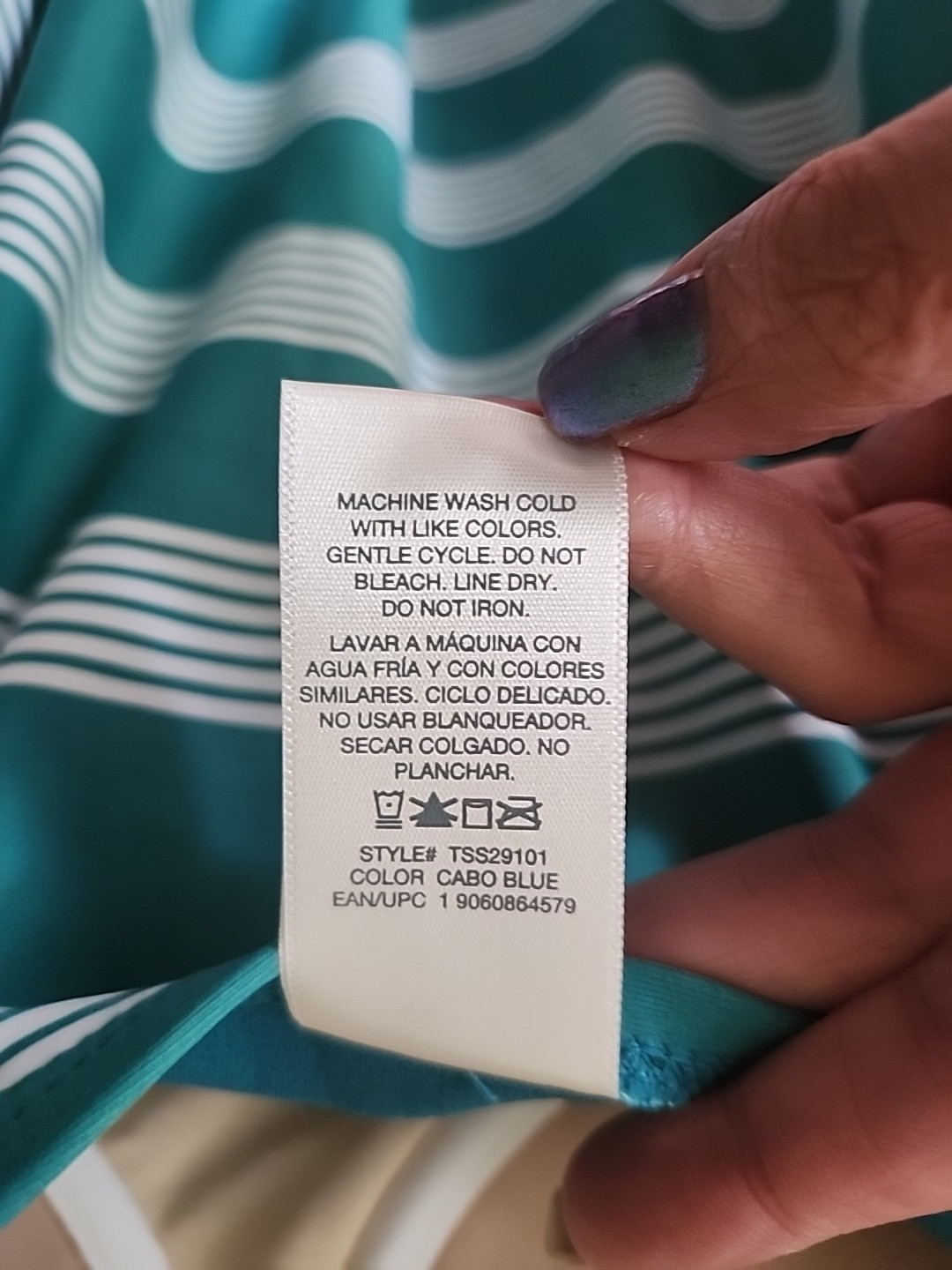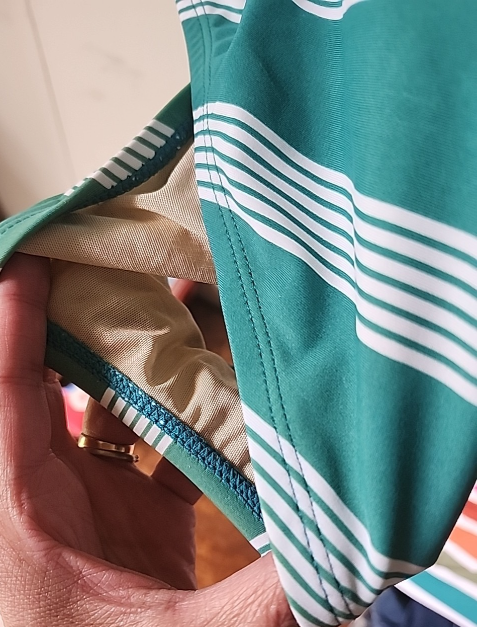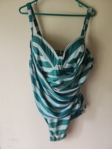 Worn one time. Excellent pre-owned condition. Washed once and has a light fading on inner side of bottom edge, please see photo. Adjustable straps. Aqua-green striped. Size 3x.