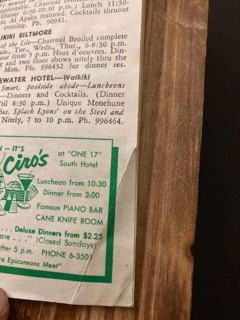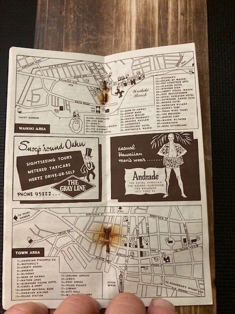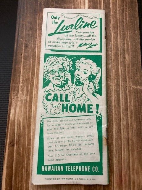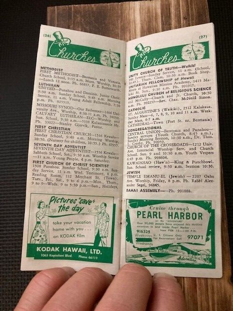 Vintage December 1955 The Honolulu Weekly Snooper Green Hawaii Travel Brochure. Overall very good. Most notably there is some rust bleed from staples on some of the center pages (refer to images) And one interior page has slight crease on bottom corner.