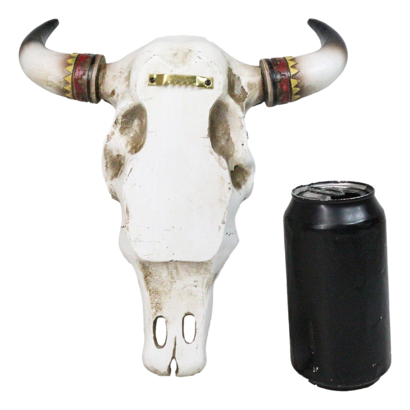 ? This Aztec Cow Skull Sculpture is made of resin, hand painted and polished. Color Tone may vary from pictures.