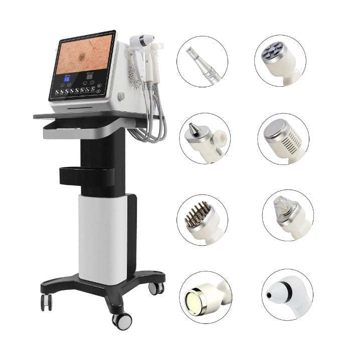 The Shape Tactics 8-in-1 Hydro Facial Skin Rejuvenation System is a multi-functional skincare device designed for deep cleansing, hydration, and revitalization. Combining hydrodermabrasion, skin detection, radio frequency, oxygen infusion, and LED therapy, this system provides a non-invasive approach to enhancing skin clarity and texture.