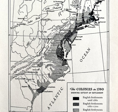 Map 1930 U.S. Colonies In 1760 5.5 x 9" Settlement History Ephemera DWEE2