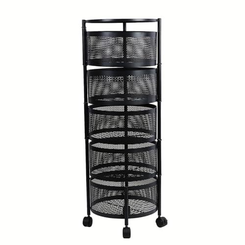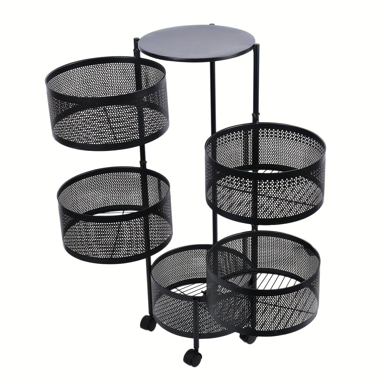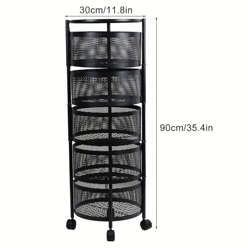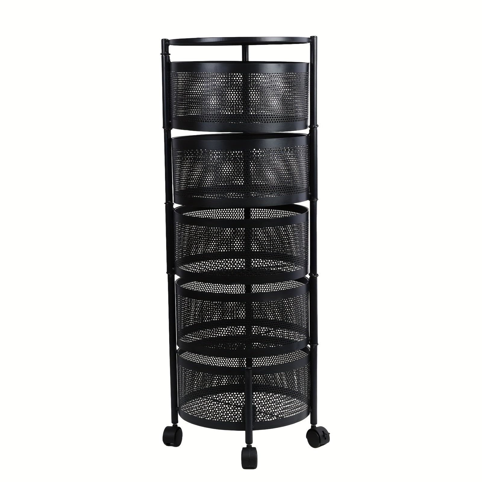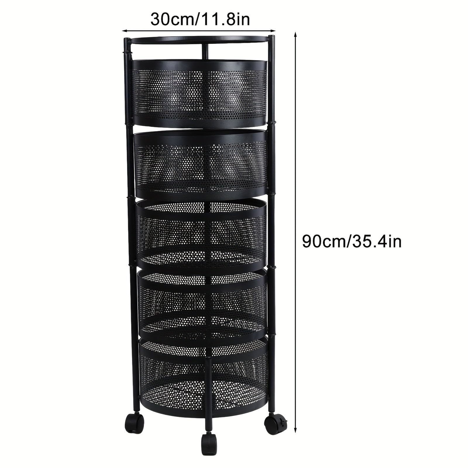 Product description: SPECIFICATIONS Material: Carbon Steel Item ID: WK194665 Descriptions: 3/4/5-Tier Rotating Basket Hollow Mesh Design: The 3/4/5-tiers Rotating Fruit Basket Design Allows You To Place Or Take Items From Any Direction. The Mesh Grid Design Allows Air To Circulate, Ensuring That The Fruits And Vegetables Are Ventilated And Have No Peculiar Smell. Movable Wheels Design: The Rotating Kitchen Storage Rack Is Designed With Four 360 Degree Rotatable Casters, Making It Easy For You To Move And Use This Storage Basket Wherever You Like. What's More, You Are Able To Move It Away So Easy To Clean The Floors That Keeping Your Ground Always Neat. Sturdy Construction: Made Of Premium High-quality Carbon Steel Material, The Kitchen Basket Is Very Durable And Sturdy. The Metal Frame Of The Storage Rack Enhances The Load-bearing Capacity. Dimension: The Fruit Rotating Basket For Kitchen Own A Large Capacity. Wide Applications: Except Fruit And Vegetable, The Kitchen Storage Cart Can Also Organize Toys, Book, Snacks, Drinks, Clothes, Plates Or Any Little Goods. A Perfect Storage Solution For Kitchen,bedroom, Laundry Room, Playroom. Item Name: Kitchen Storage Rack Material: Carbon Steel Style: Modern Number Of Layers: 3/4/5 With Or Without Pulley: Yes Features: Hollow Mesh, Heighten Guardrail, Rotating Size Details: Guardrail Height: 14cm/5.52" (Approx.) Pipe Diameter: 3cm/1.18" (Approx.) Basket Diameter: 30cm/11.82" (Approx.) Rack Height: 60cm/23.62", 75cm/29.53", 90cm/35.46" (Approx.) Notes: Due To The Light And Screen Setting Difference, The Item's Color May Be Slightly Different From The Pictures. Please Allow Slight Dimension Difference Due To Different Manual Measurement. Package Includes: 1 X Kitchen Storage Rack