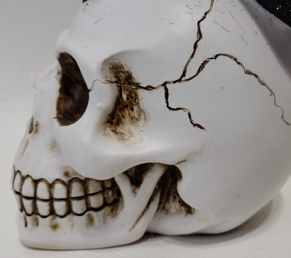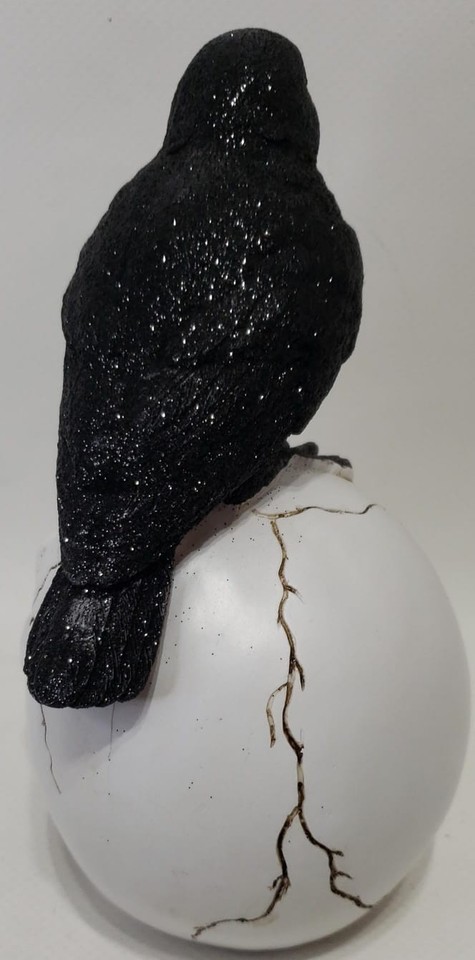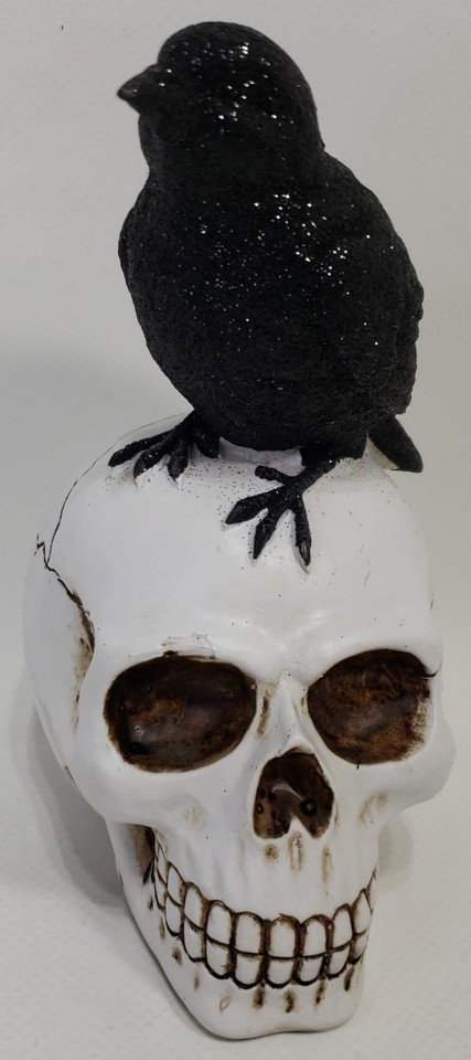 Made in China, this statue features a realistic raven perched on a skull,