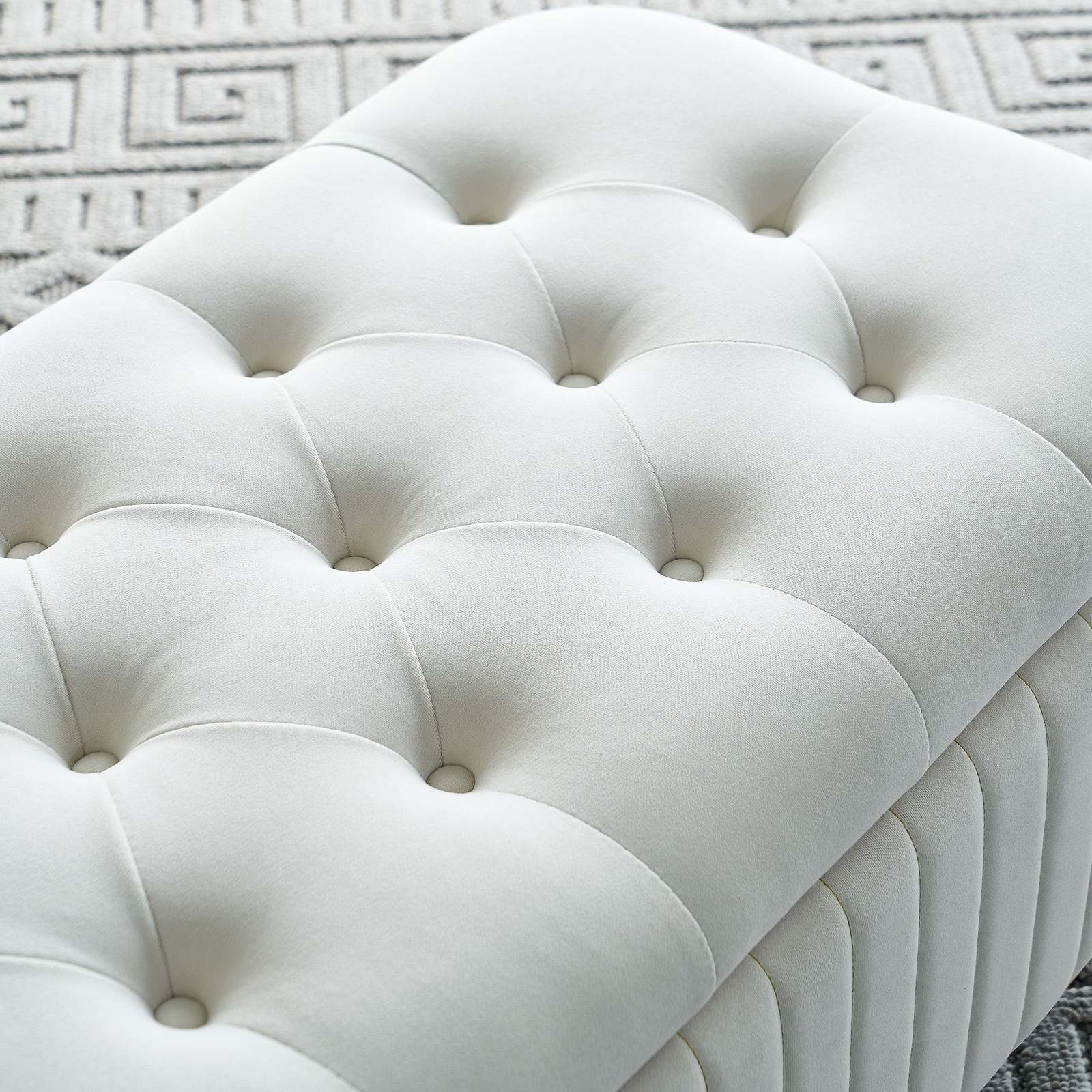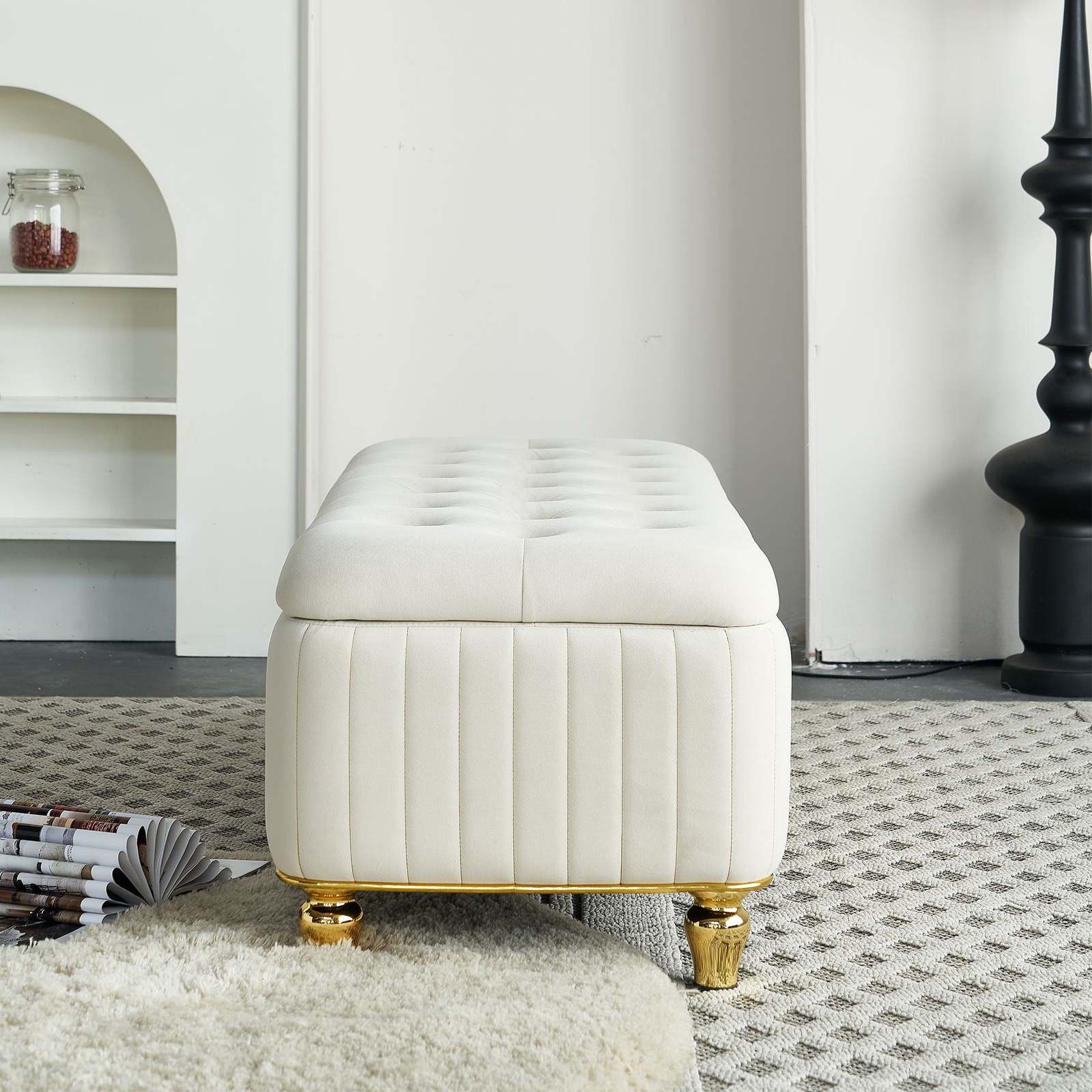 Beige Velvet Storage Ottoman Bench - Gold Accent Footstool for Living Room