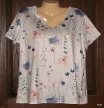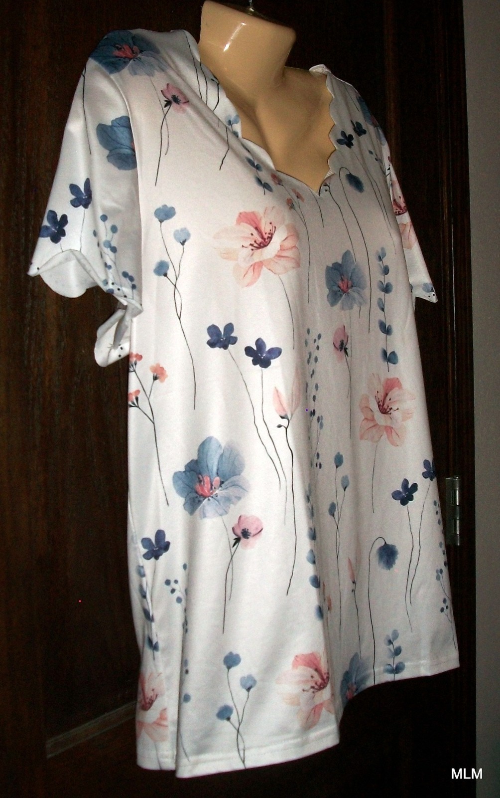 This feminine floral blouse features a scalloped v-neckline, short sleeves, and a slinky polyester material.