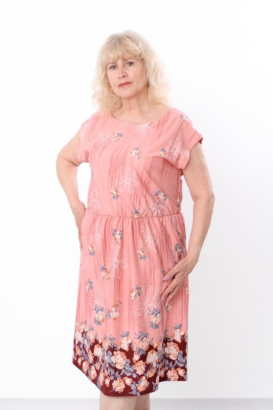 The dress features a straight silhouette with a slightly gathered elastic waistband that accentuates the waistline. The shoulder line is even and slightly dropped (kimono style), with a boat neckline and a length above the knee. This model is suitable for both young girls and mature women. The fabric is printed and made from cotton fiber.
