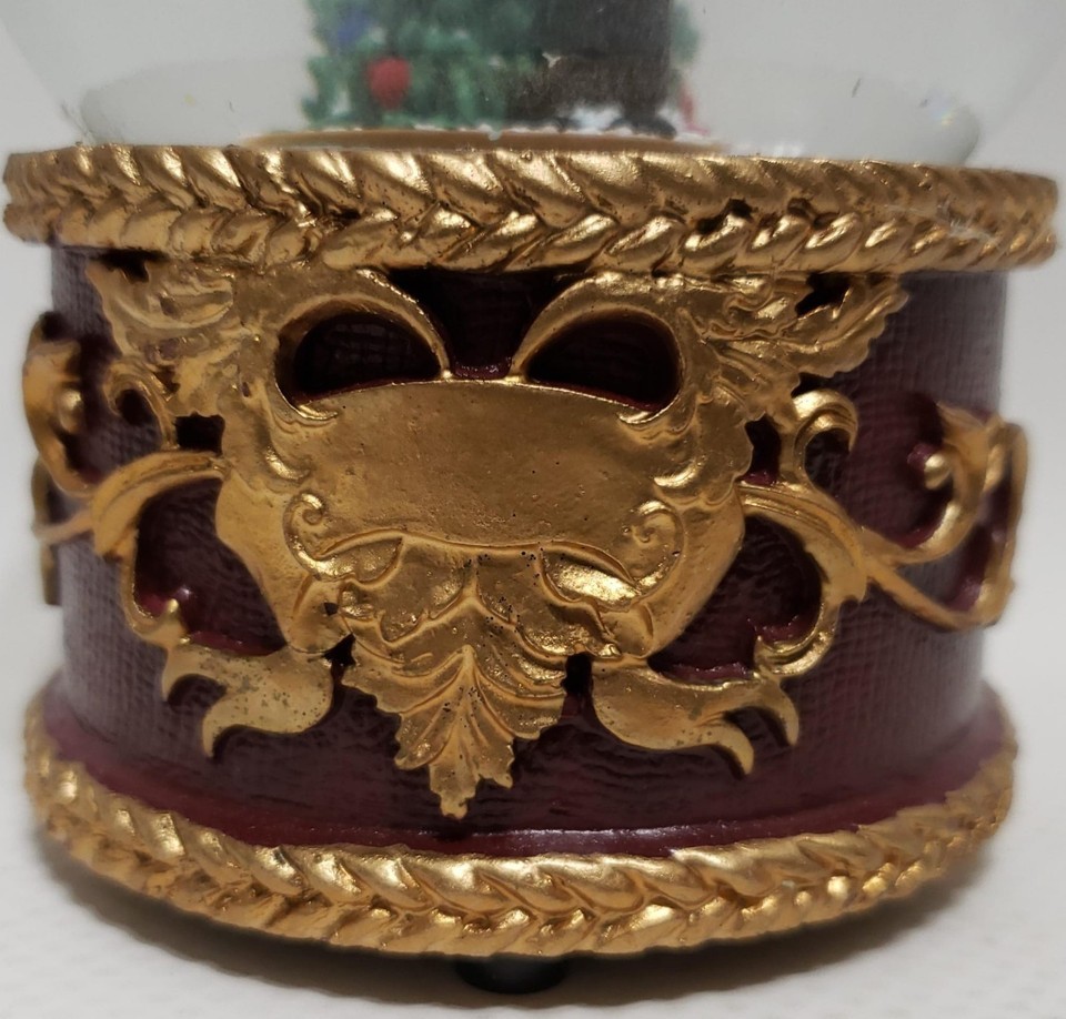 Ornate Musical Base: The globe sits atop a richly detailed base in deep red with intricate gold-toned scrollwork and a central blank plaque (ideal for personalization if desired). This base likely houses the musical mechanism, playing a classic Christmas tune (common for such items).