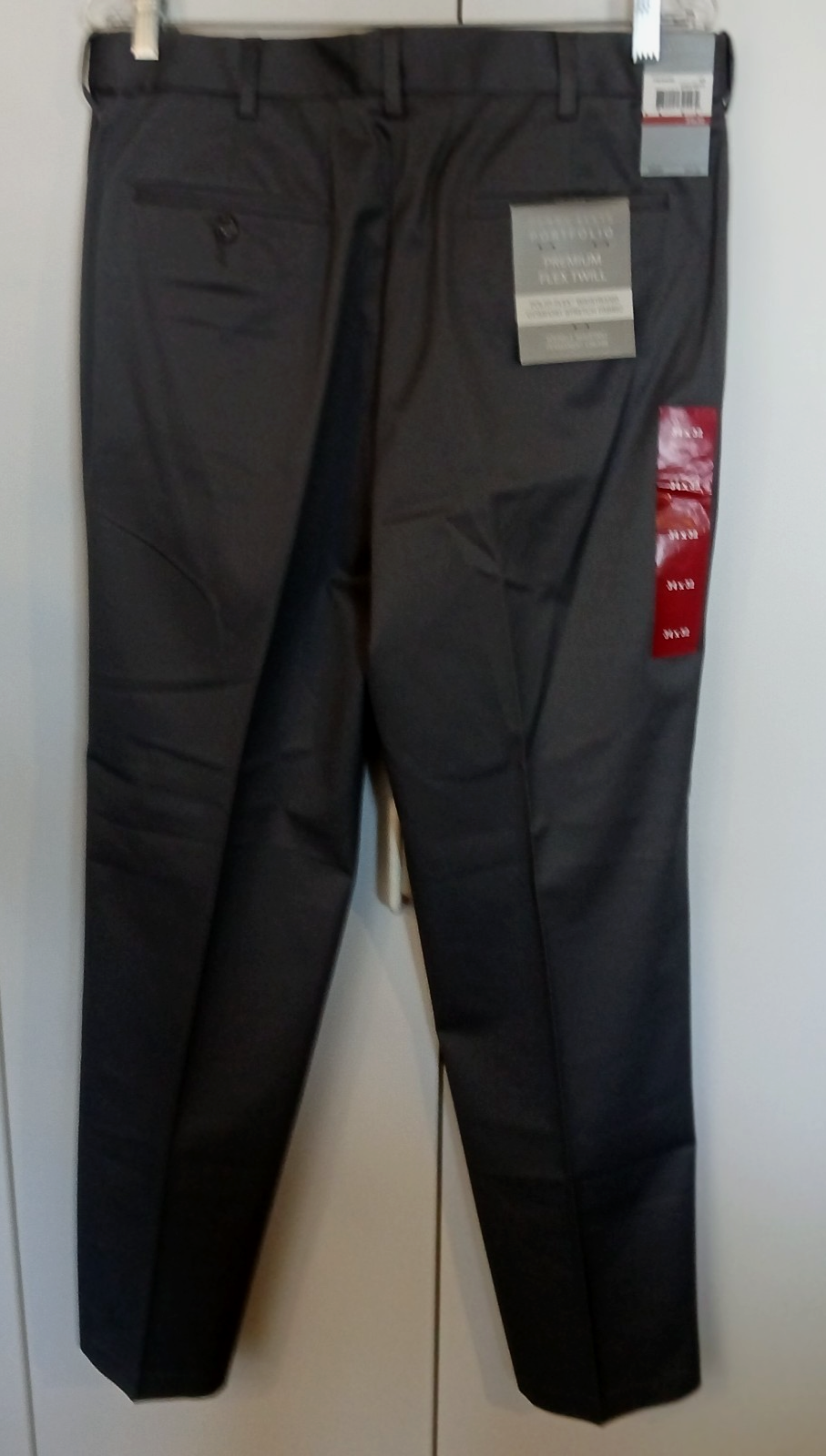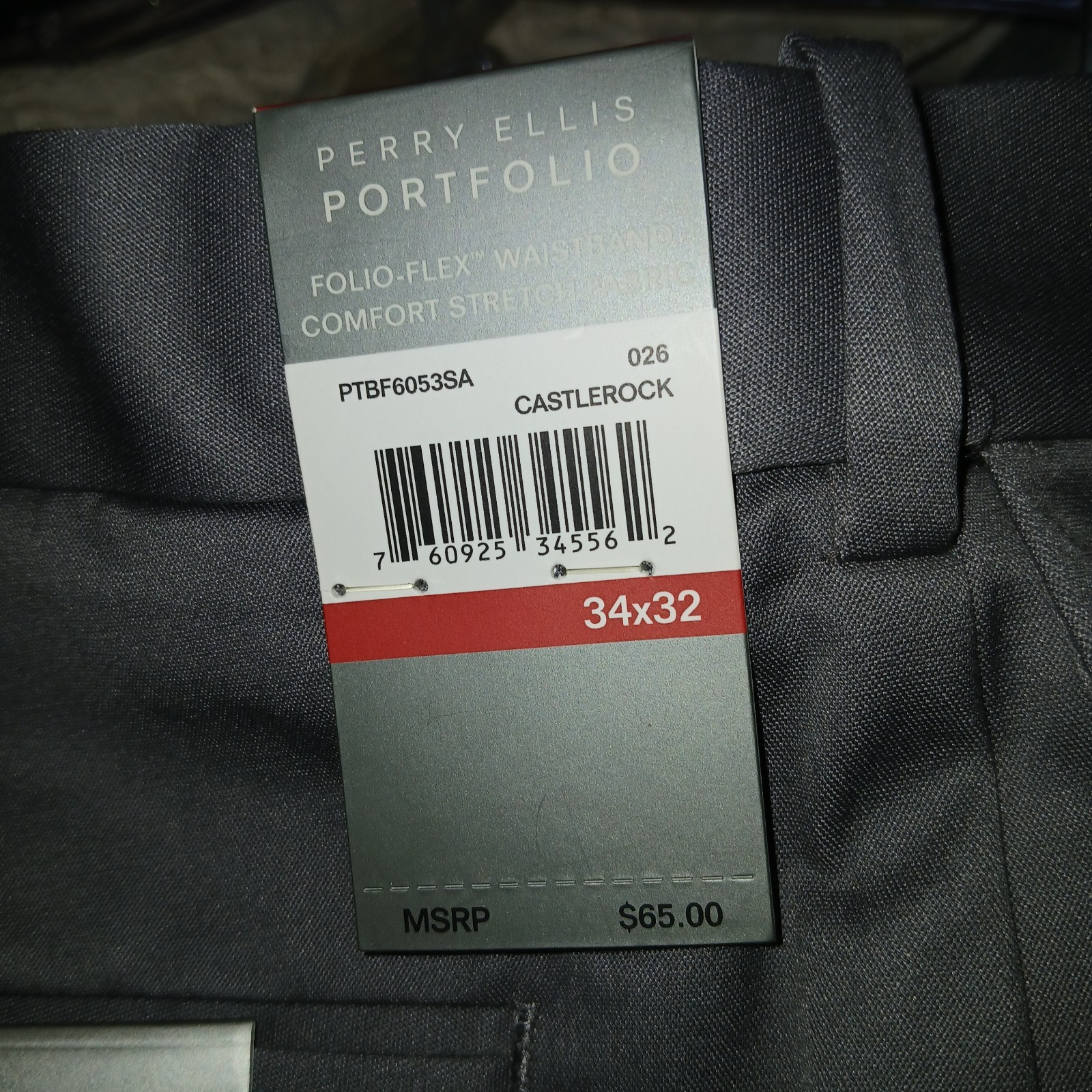 THIS IS A GREAT PAIR OF MEN'S PERRY ELLIS PORTFOLIO PREMIUM FLEX TWILL GRAY STRETCH PANTS IN A SIZE 34x32. THEY ARE NEW, WITH TAGS, AND PRICE TAG OF $65.