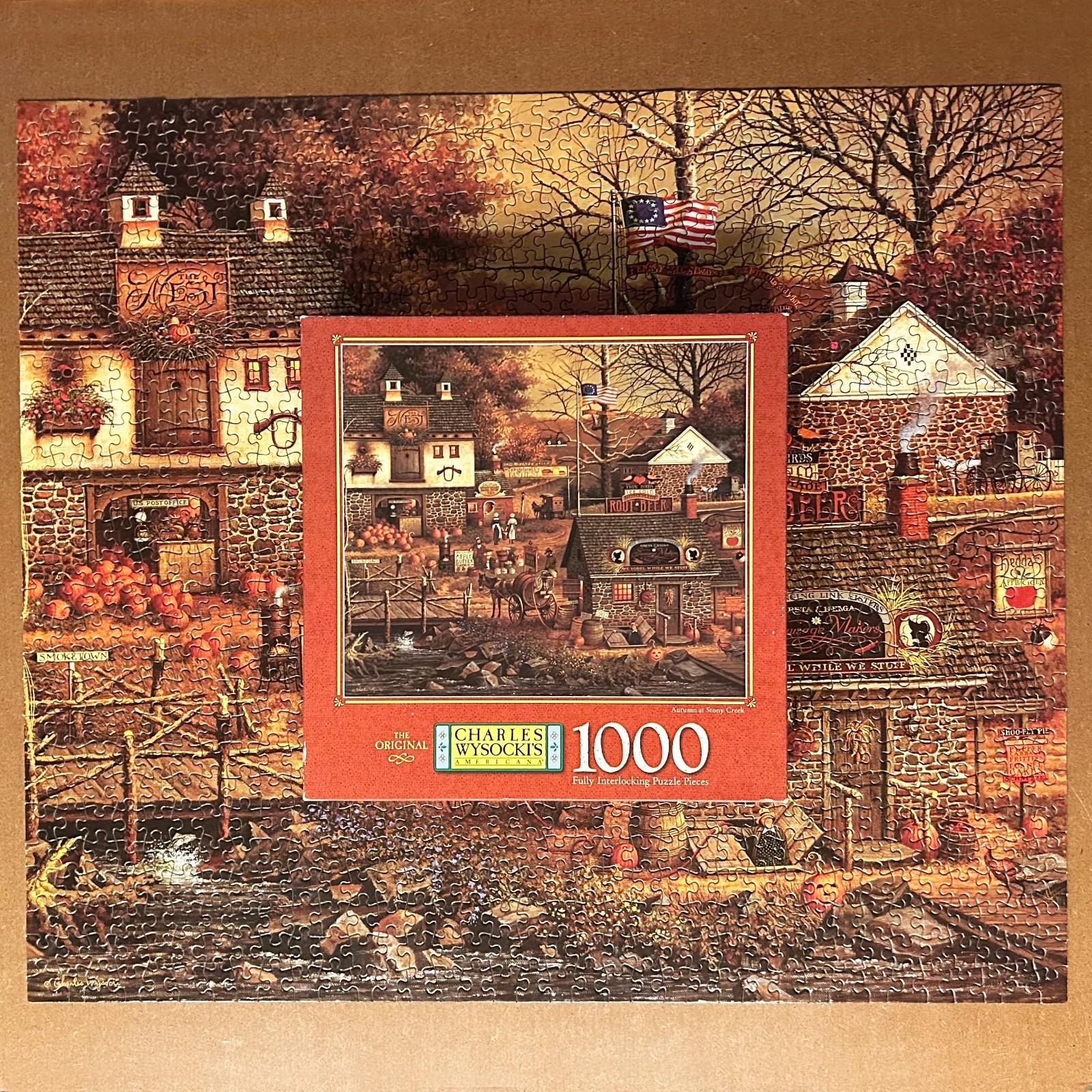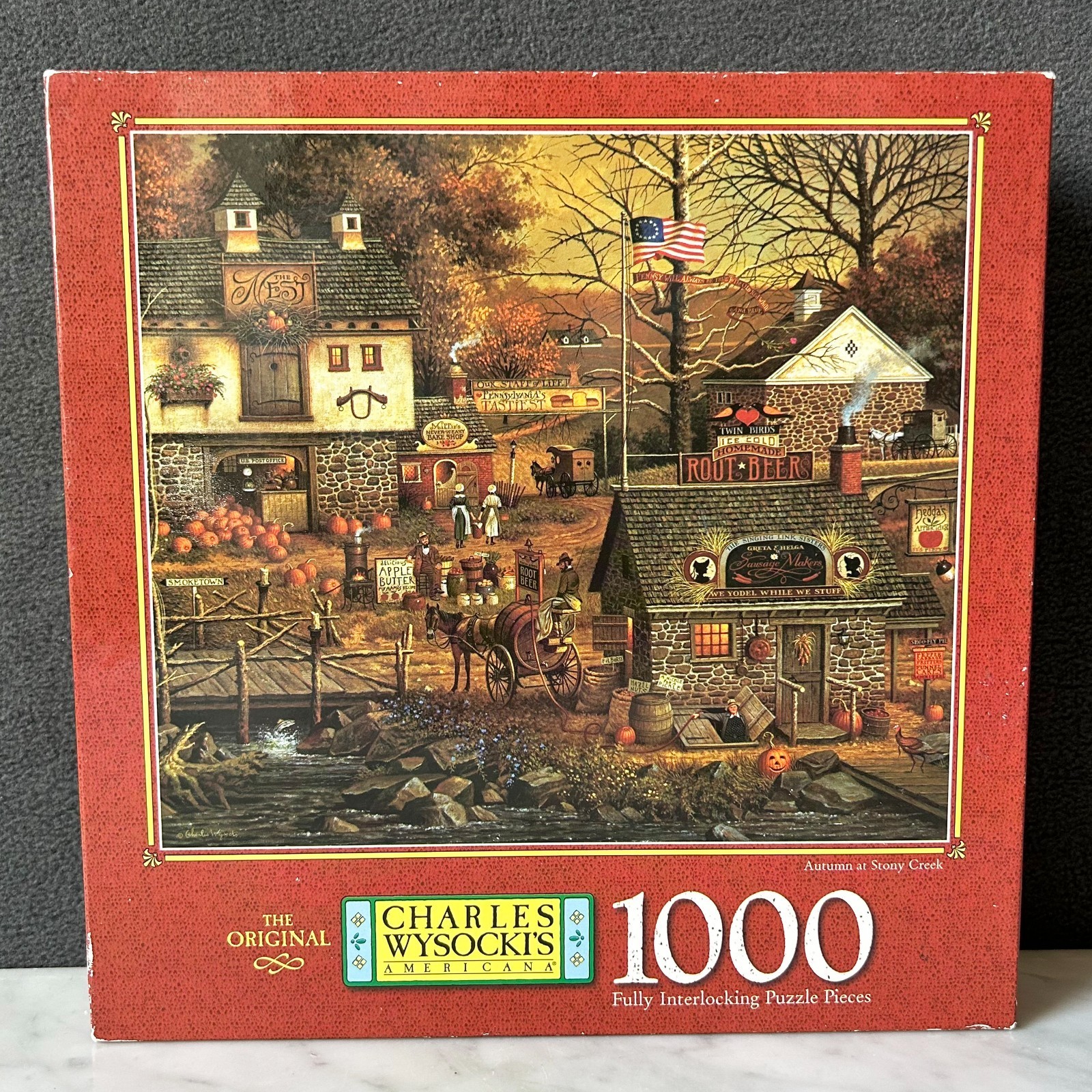 Charles Wysocki's Americana Autumn at Stony Creek jigsaw puzzle is complete and in excellent condition. Vintage 1997 Milton Bradley, 1000 pieces. 22-9/32" x 25-9/16" (56.59 x 64.92 cm). We put puzzles together before reselling to ensure they are complete. Pieces stored in resealable bag. There is writing on the back of the box.
