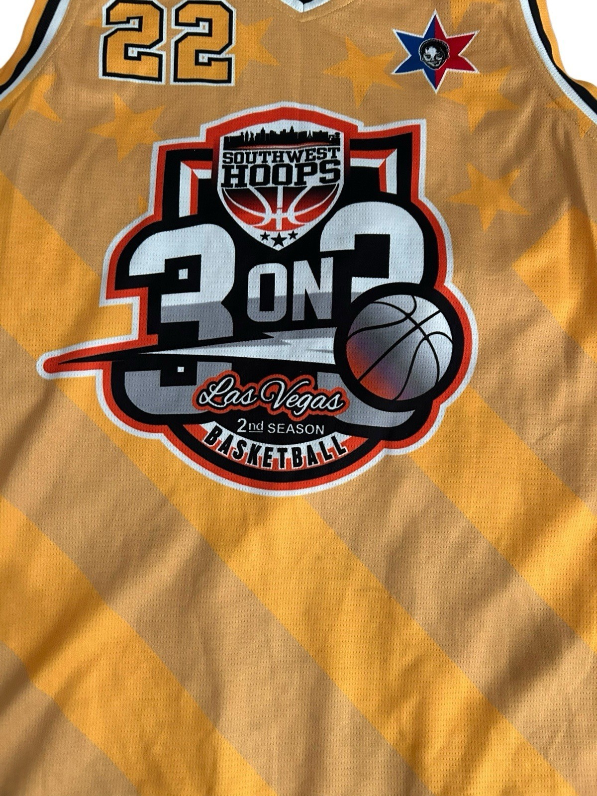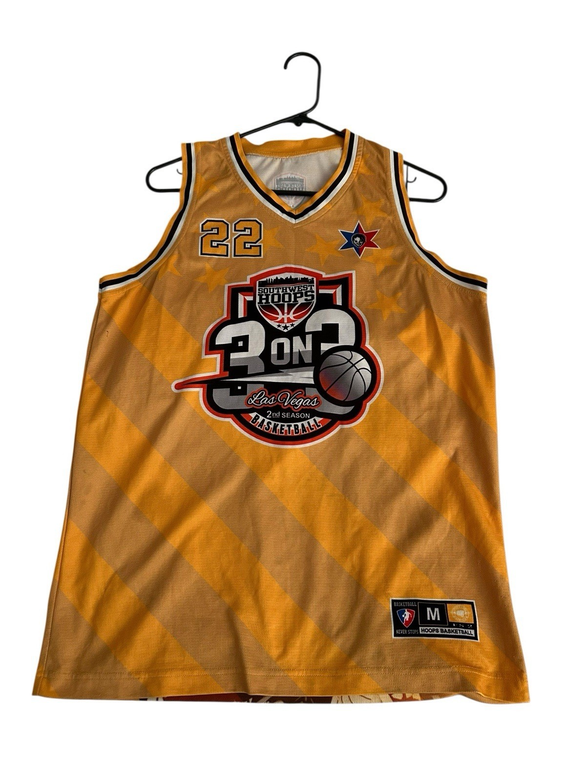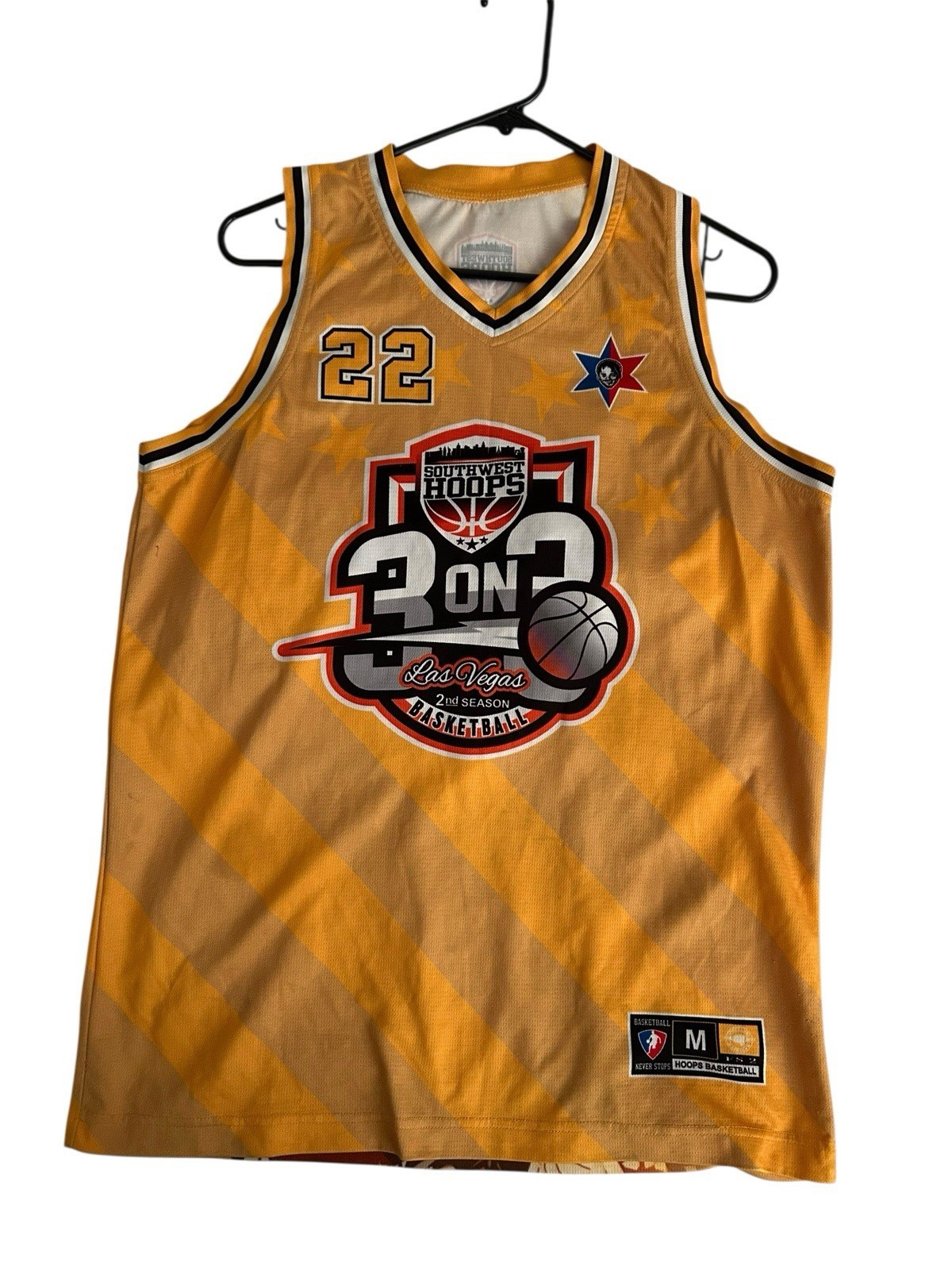 The Southwest Hoops 3 on 3 Tournament Jersey with a unique Kobe Bryant of the Los Angeles Lakers picture is a highly sought-after item for basketball fans. This officially licensed jersey in size M is a rare find for collectors looking to show their support for the NBA legend. The gold color and iconic team logo make it a standout piece of fan apparel for men who appreciate both style and functionality on and off the court.