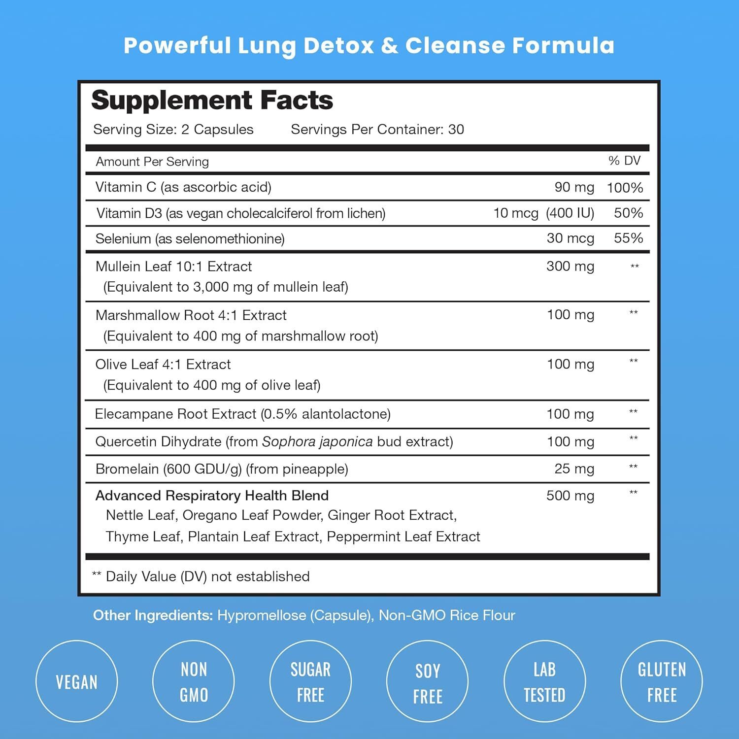 15-in-1 Lung Detox Formula - We?ve combined nature?s best ingredients to address all areas of lung health; from detoxification cleansing, to comfortable breathing daily support. Made with key ingredients Mullein Leaf, Selenium, Bromelain more! 3000 mg of Mullein Leaf - This powerful plant is used globally to promote respiratory system health clear breathing. Our high potency 10:1 extract delivers excellent results in helping the body loosen and expel excessive mucus. Breathe Comfortably, Year Round - Designed to enhance your airways so you can breathe easier, our comprehensive formula provides the immune and respiratory protection you need to thrive through every season. Advanced Respiratory Health Ingredients - Our advanced respiratory health blend contains ingredients such as ginger root, oregano leaf, and peppermint leaf that have been traditionally used to soothe respiratory tissues and support bronchial health. Highest Quality Formula Manufacturing - Lab Tested Verified | Vegan | Made in USA | Non-GMO | Sugar-Free | Gluten-Free | Allergen-Free | Soy-Free | Nut-Free | Zero Animal Products | No Artificial Colors or Flavors