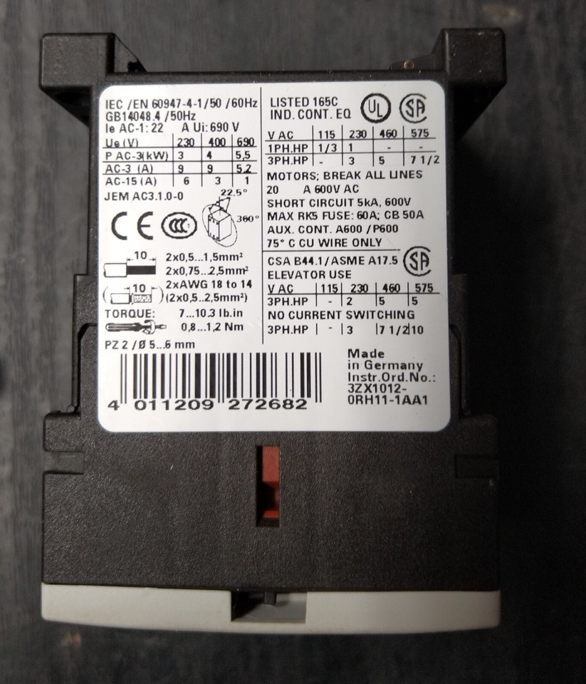 SIEMENS SIRIUS 3rt1016-1ap01 contactor 20 a 600v ac