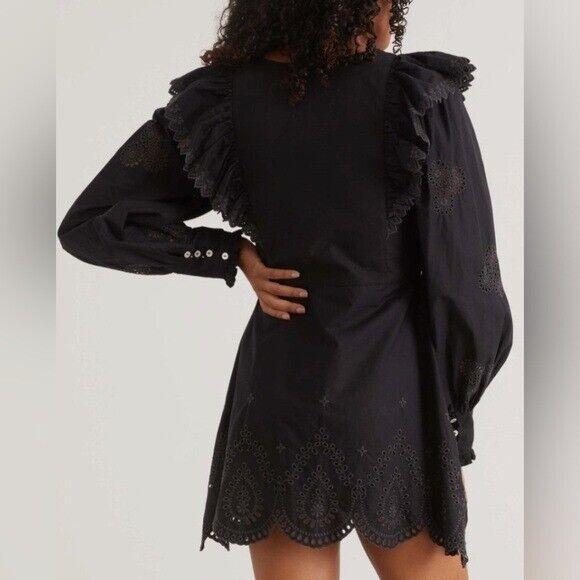 LoveShackFancy Tullia Embroidered Dress in Black Size 6 - Cotton - Silhouetted by ruffle-layered shoulders, LoveShackFancy's black Tullia mini dress is crafted from cotton accented with intricate schiffli embroideries, eyelet accents and scalloped trims and ruffles
