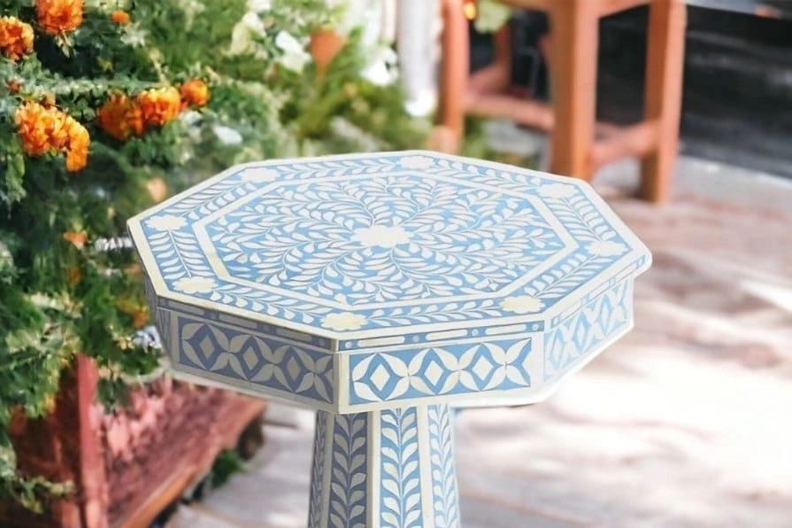 Elevate your space with the timeless charm of the Heritage Inlay Floral Pattern Pedestal Side Table from Timeless Inlays. This exquisite piece is meticulously handcrafted by skilled artisans using a unique combination of resin and ethically sourced Heritage, resulting in a stunning floral design that radiates bohemian sophistication.