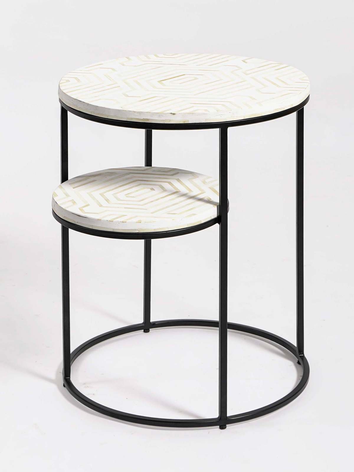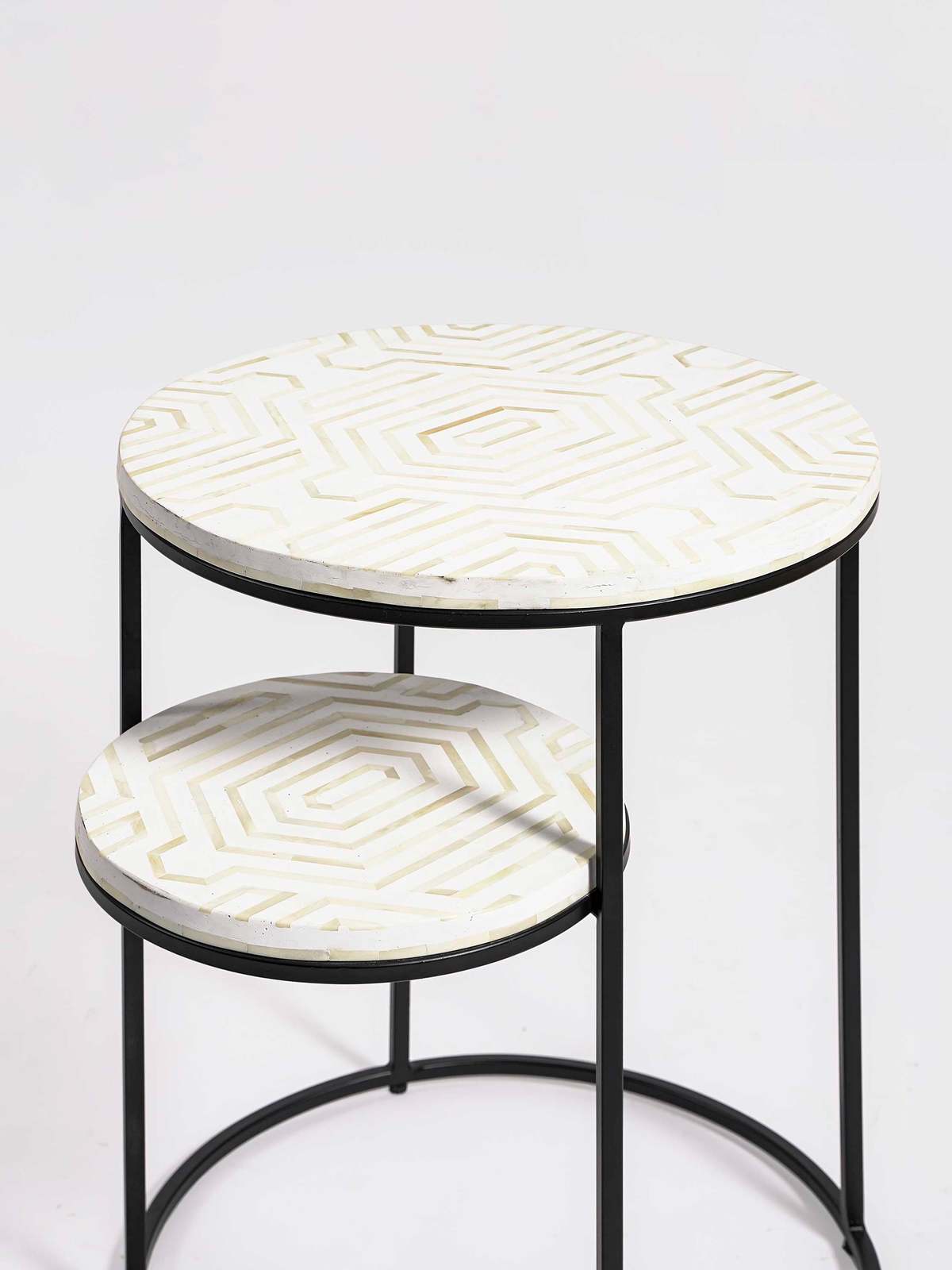 Add a splash of elegance and versatility to your space with our Azure Inlay Nesting Tables. Handcrafted by skilled artisans, each table features a stunning white-and-white inlay pattern that reflects timeless craftsmanship and modern charm.
