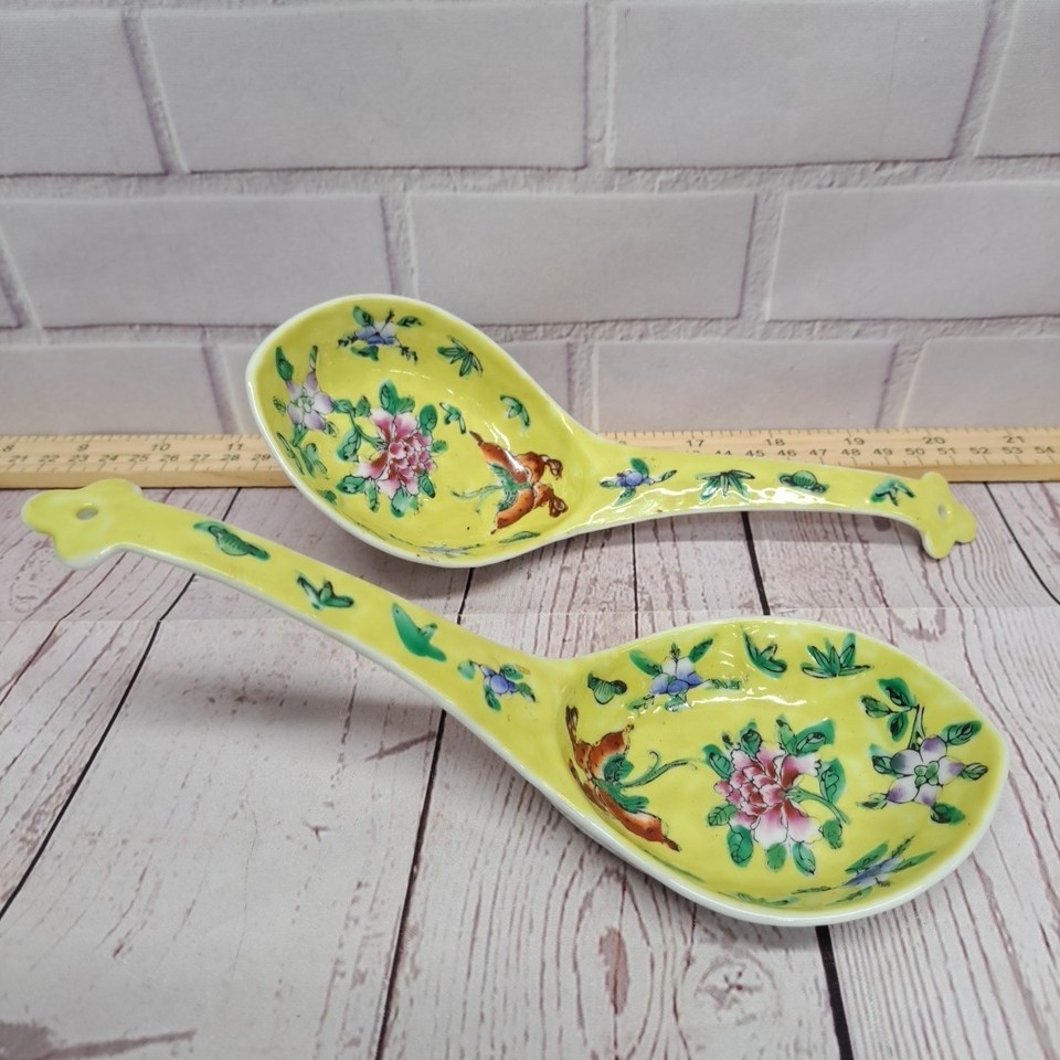 The product is a set of two large spoons or wall decor with a yellow floral design, made of porcelain and with a Chinese cultural influence. The spoons feature a blue and green color palette and are manufactured in China. These vintage ACF Hong Kong pieces are not handmade, making them a unique addition to any collection of Chinese cultural artifacts.