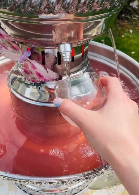 One of our signature handcrafted heaviest-gage stainless steel fountains. They are designed to encompass superior craftsmanship and timeless appeal. This fountain can create a unique self-serving beverage station - which can alleviate the pressure on bar staff or create a stations specifically for a signature drink at cocktail hour, happy hour, location for a transitioning space, or a place created just for the kids. All of our fountains serve alcoholic and non-alcoholic beverages: punch, champagne, sweet tea, lemonade and cocktails. In fact, fi you can mix ti behind the bar, you can pour it into a fountain!