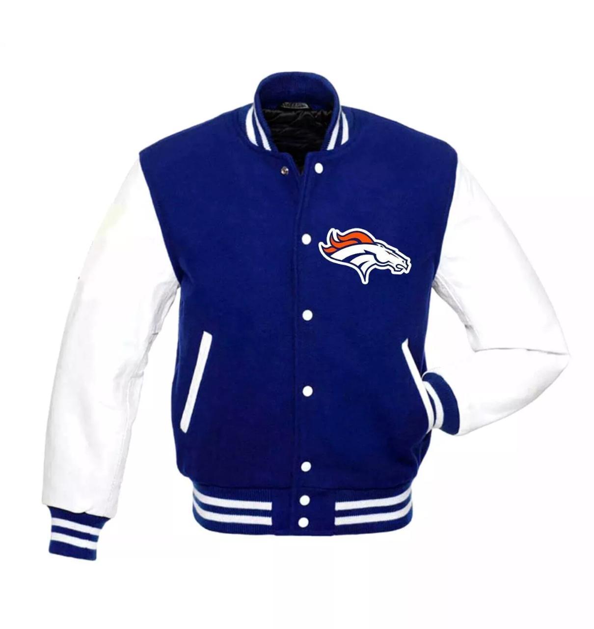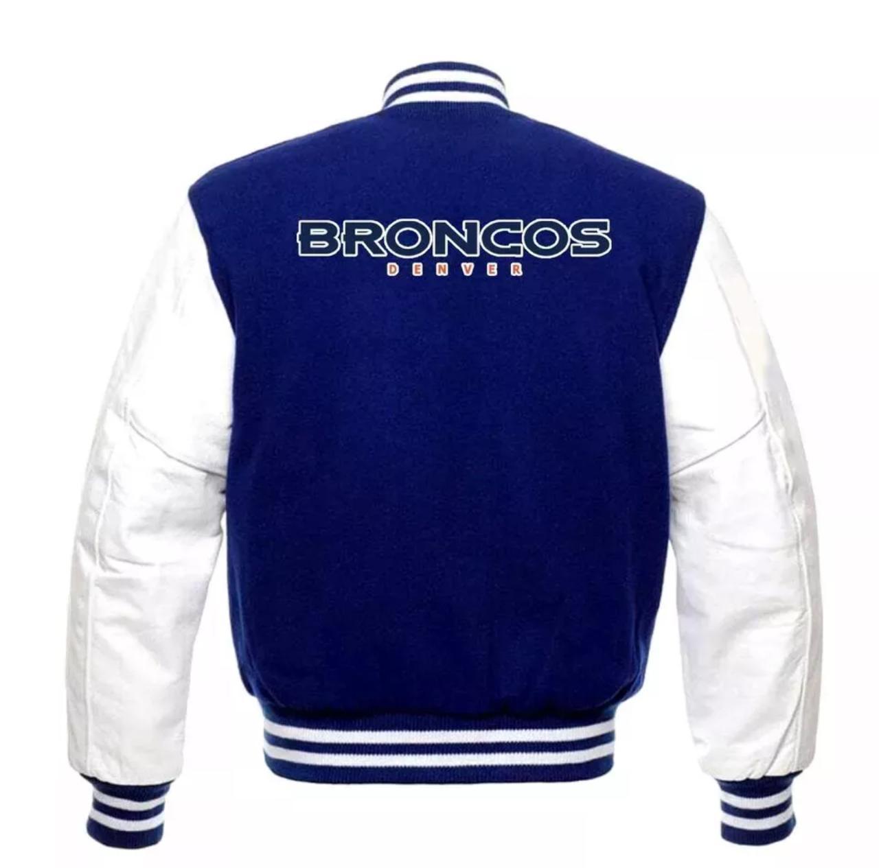 DSHARKS Denver Broncos Blue Wool White Genuine Leather Sleeves Varsity Jacket