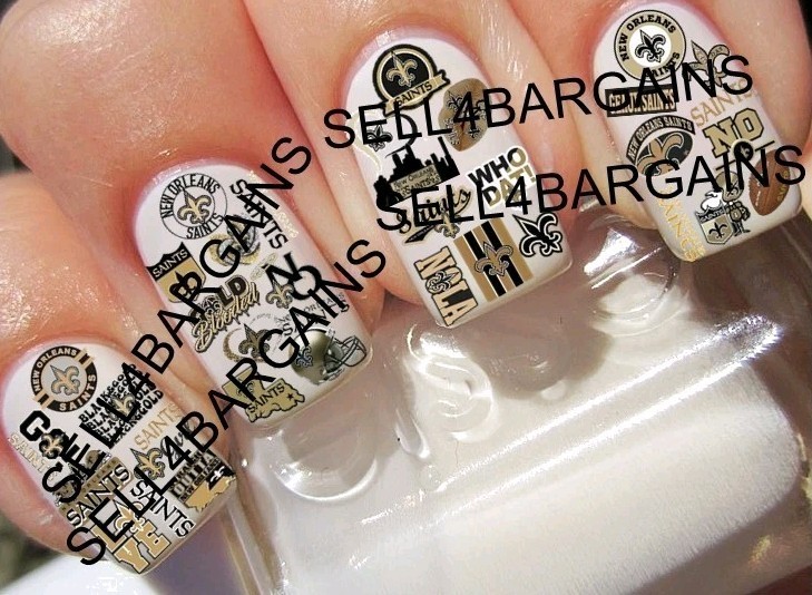 This is a listing for 70 New Orleans Saints salon quality promo nail decals with clear transfer graphic art nail designs as pictured.