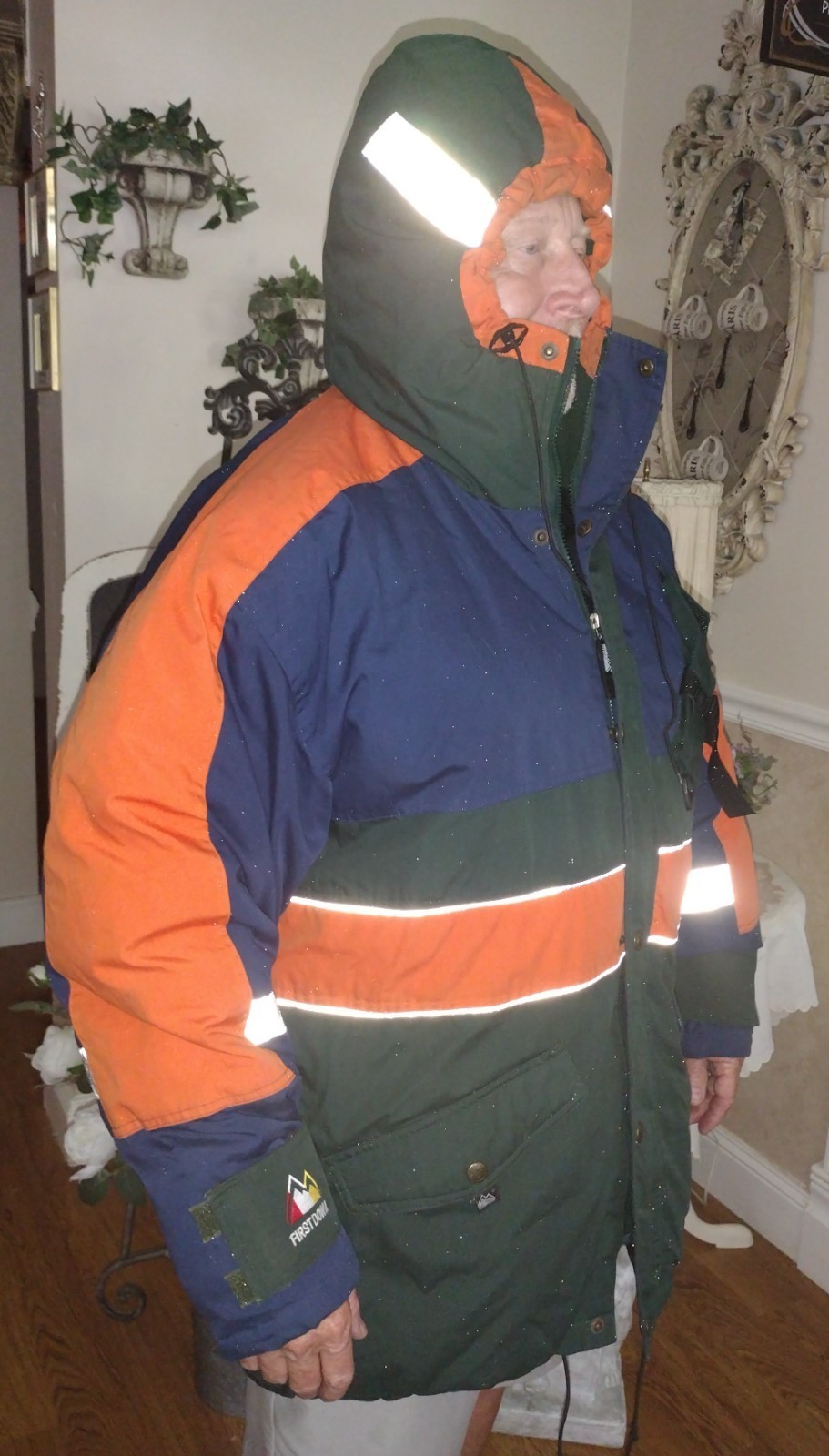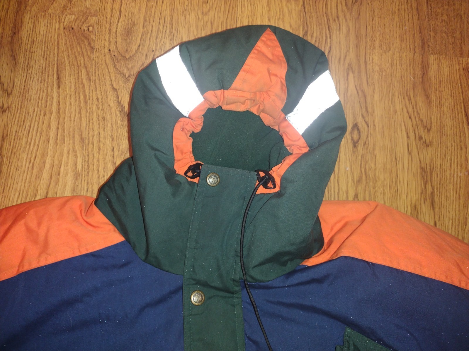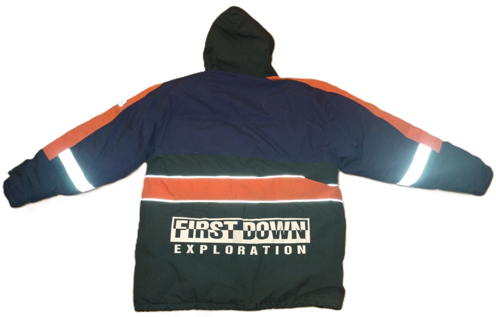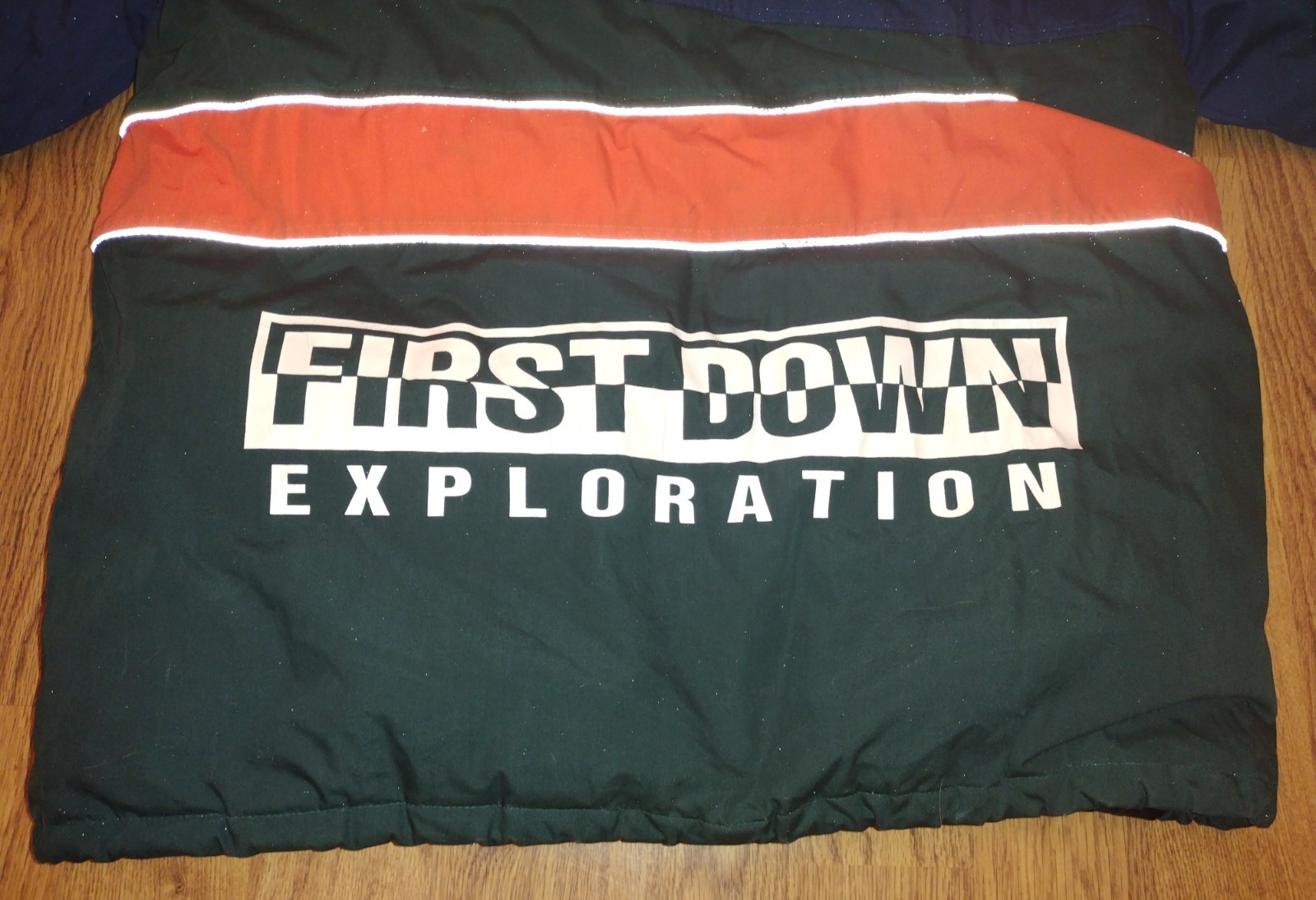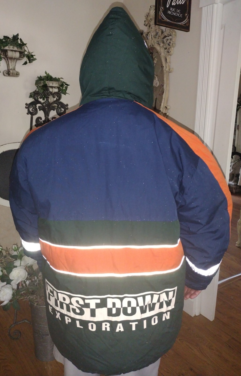 Pre-Owned First Down Exploration Ski Jacket/Coat Men's XL Vintage Color Block Duck Down. The coat is a serious cold weather coat with hood, drawstring at hood and bottom. It has an interior waist closure, hook and loop wrist, walkie talkie pocket at chest and reflective markers. Please use the photos to determine the condition and size of the coat. Ships insured.