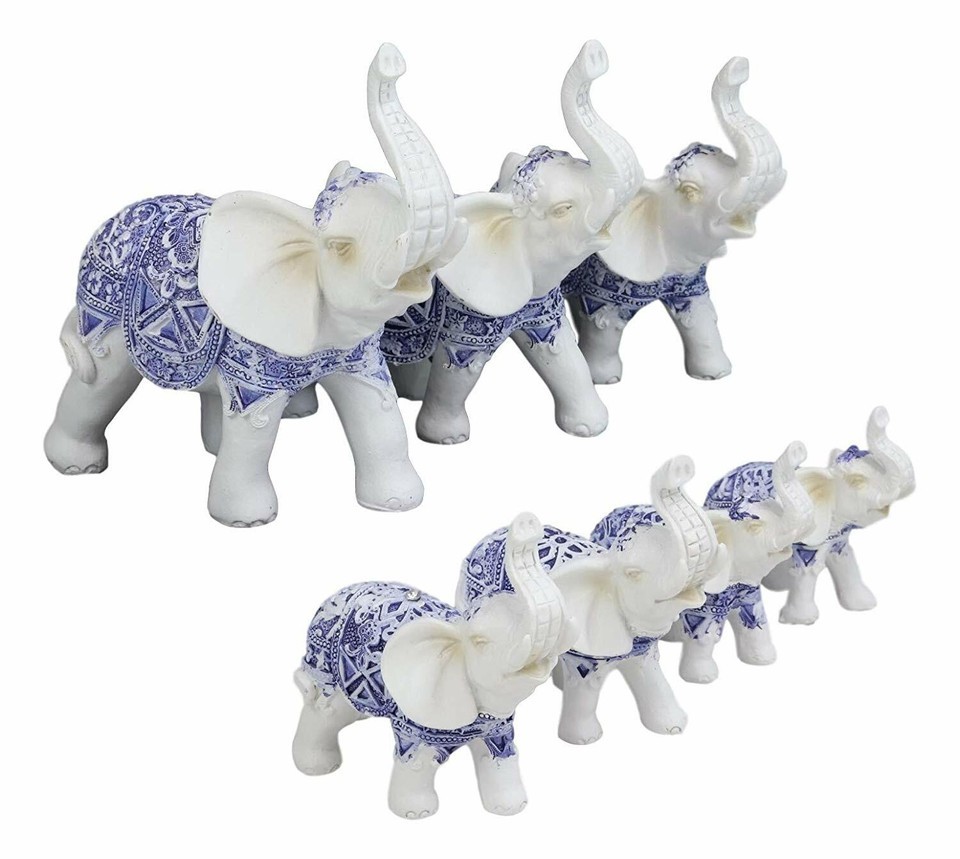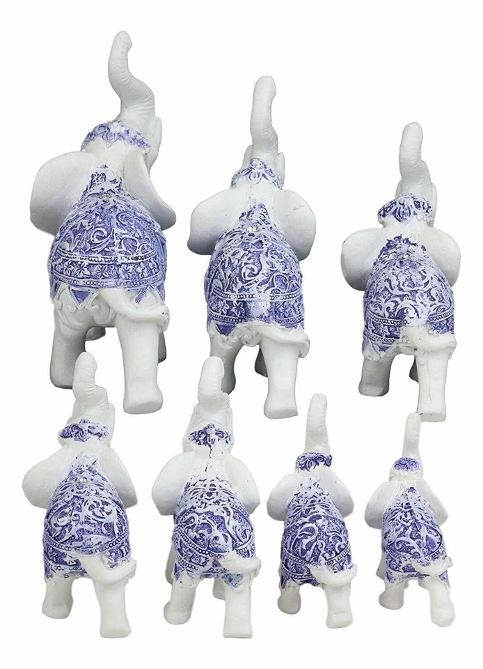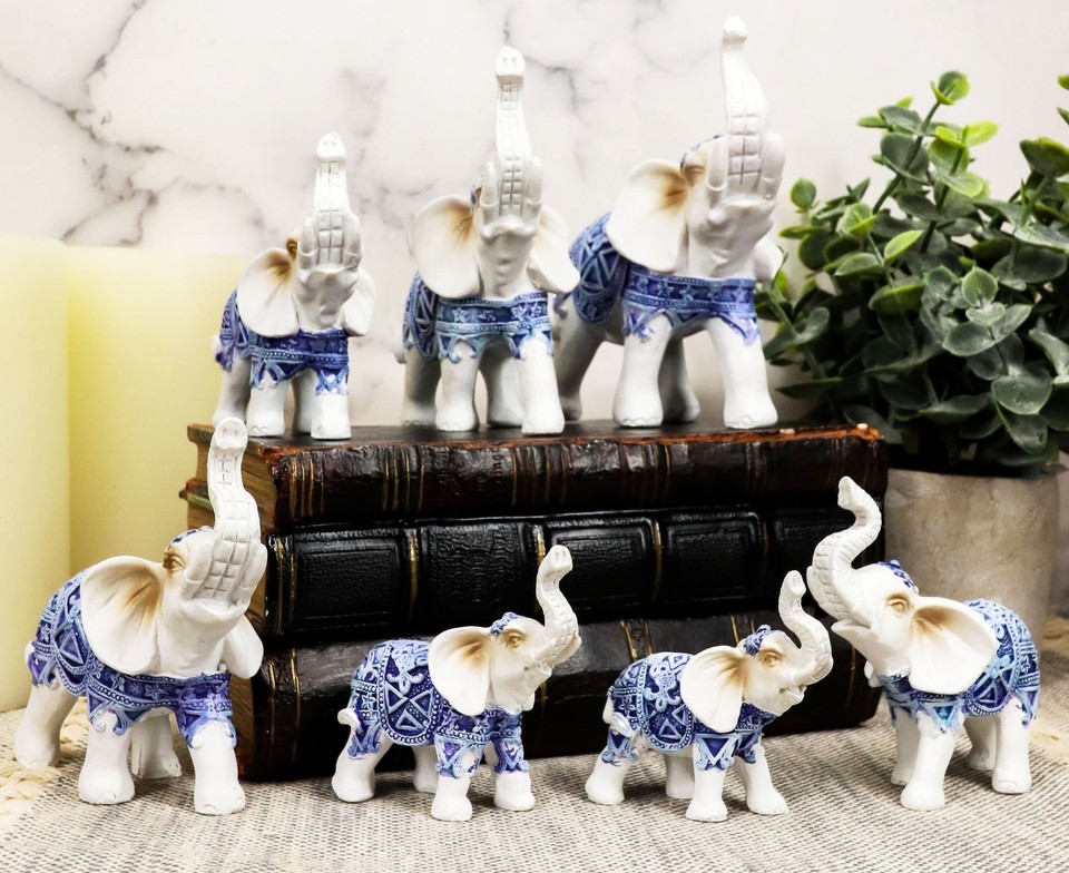 Ebros Blue White Feng Shui Miniature Thai Buddhism Elephants With Trunks Up Set of 7