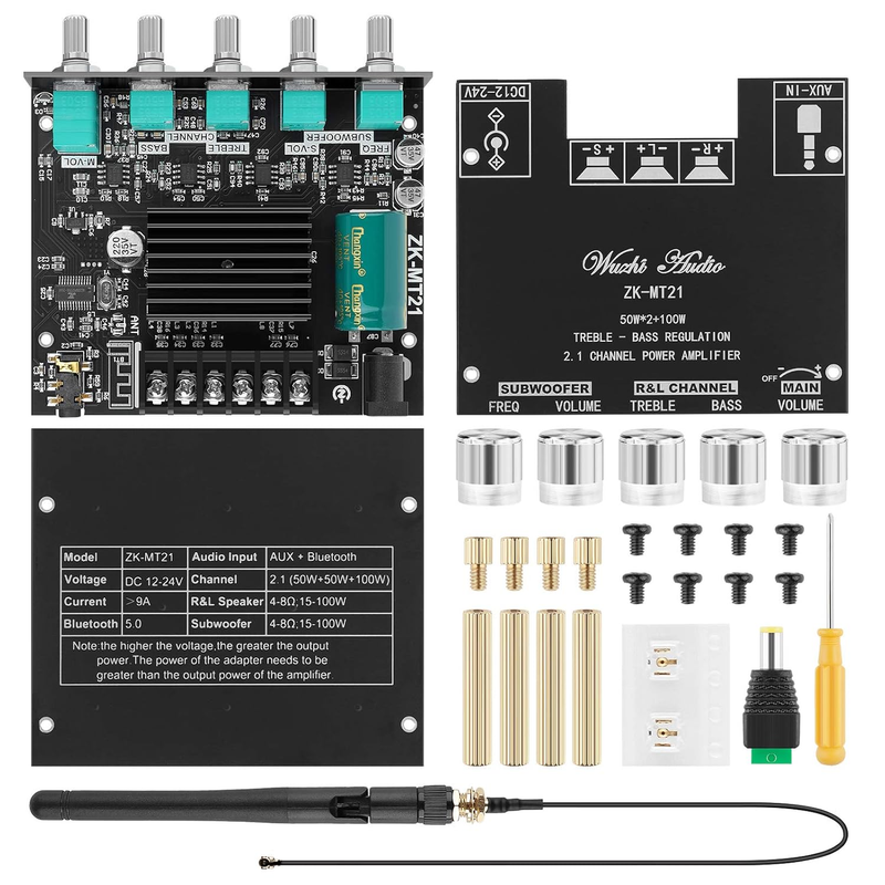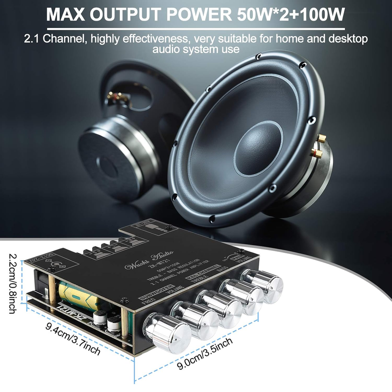 [High Performance] Blue tooth audio amplifier module 2.1 channel, Max output power 2X50W+100W. With antenna and antenna base, the signal is better, the efficiency is high, and the anti-interference ability is strong