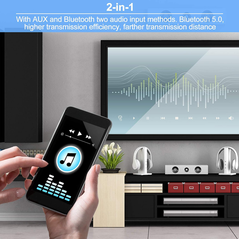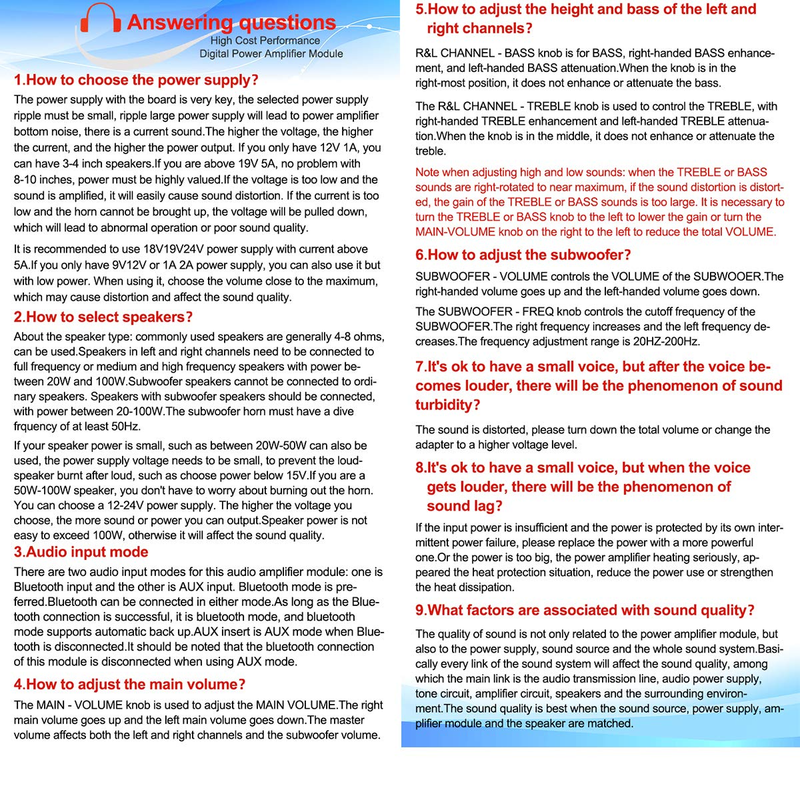 [2-in-1] High quality power amplifier board. With AUX and Blue tooth two audio input methods, 2-in-1. 5.0 Bluetooth version, the transmission efficiency is higher, the transmission distance is farther