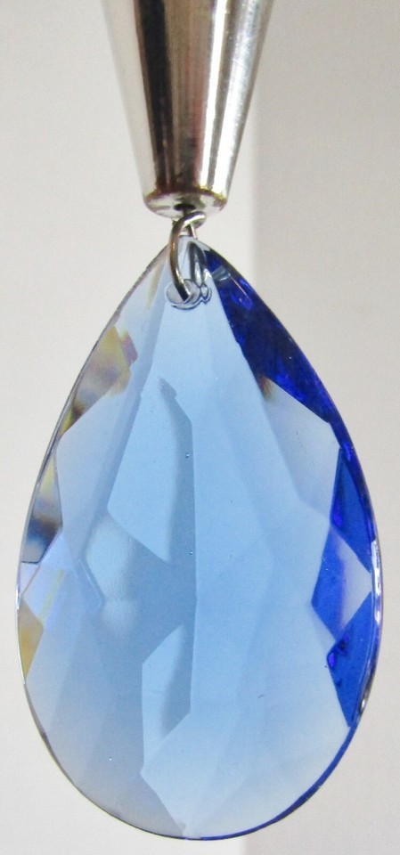 This chandelier is made by Schonbek. It has a silver frame mounted with solid hand cut Swarovski crystal in clear and blue. It has 6 candelabra sockets and is complete with original chain and crystal canopy.