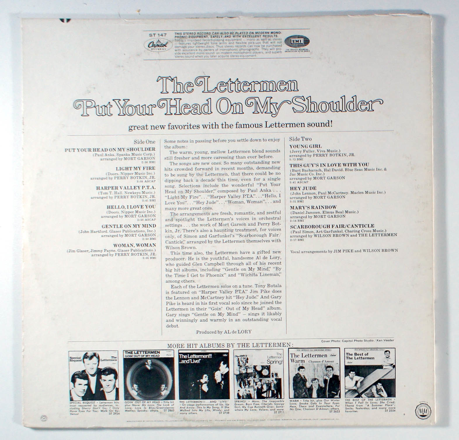 Put Your Head on My Shoulder, by Lettermen, reached No. 43 on the Billboard 200 Albums Chart. The title track was a minor hit in the USA and Canada.The arrangements on this album are fresh, romantic, and zestful and spotlight the Lettermen's voices in orchestral settings. There's also a haunting treatment, for voices only, of Simon and Garfunklel's Scarborough Fair, arranged by The Lettermen themselves with Wilson Brown.