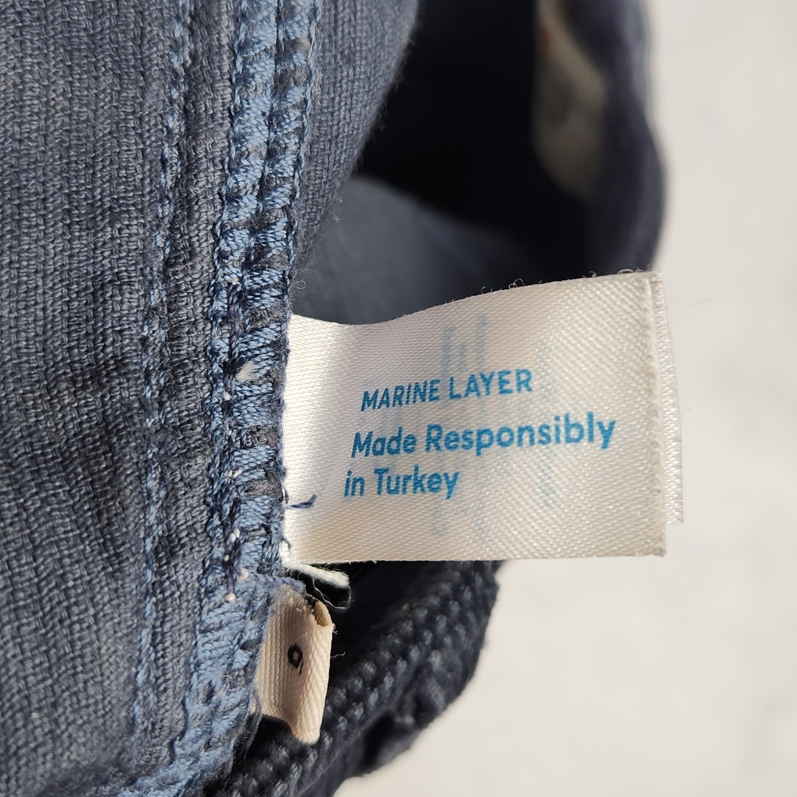 The Marine Layer Jeans for women in size 6 feature a trendy corduroy fabric in a stylish blue color. These high-rise flared leggings are made from a comfortable blend of spandex and cotton, with a durable construction suitable for year-round wear. The jeans have a solid pattern with a classic zip and button closure, and are machine washable for easy care. With accents like buttons, zippers, and the Marine Layer logo, these jeans are great for any season and offer both style and functionality for any wardrobe.