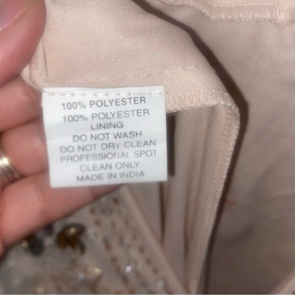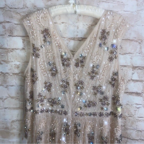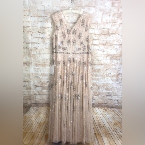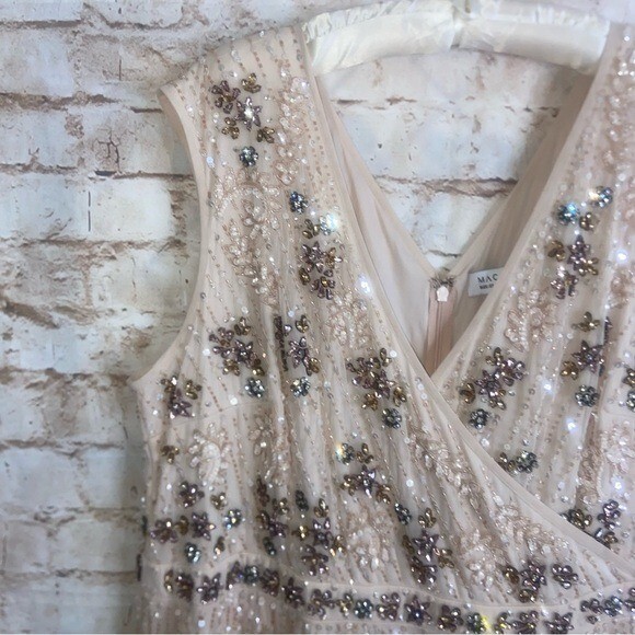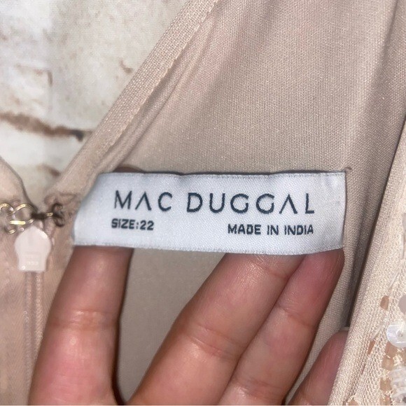 Mac Duggal Embellished Wrap Over Cap Sleeve A-Line Gown in Blush Style 93575 Size 22 NWT - Hand-embellished mesh overlay; 100% polyester lining, Fully lined through body. V-neckline, Cap sleeves, All-over floral encrusted jewels and sequined detailing. Concealed back zipper. Color is Blush
