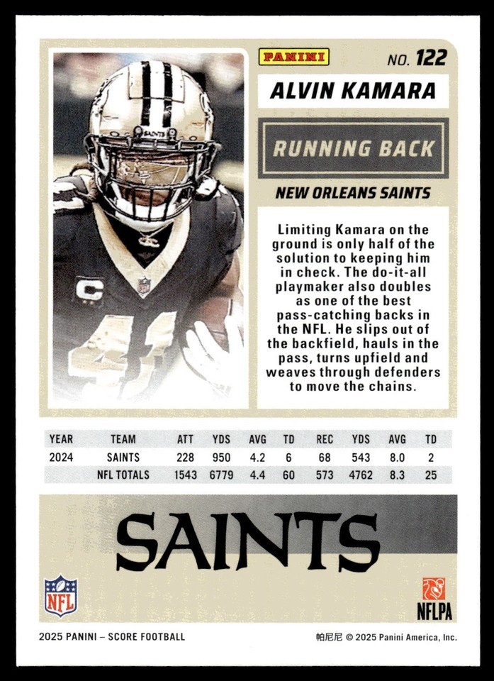 2025 NFL SCORE Panini Football Card Alvin Kamara New Orleans Saints 122