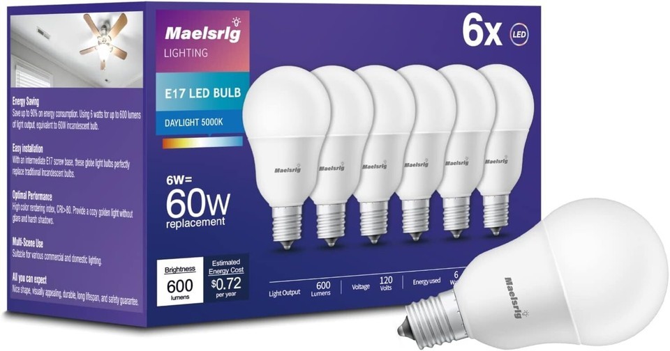 6W E17 Intermediate Base LED Light Bulbs - Energy-Saving, 600 Lumens, Pack of 6