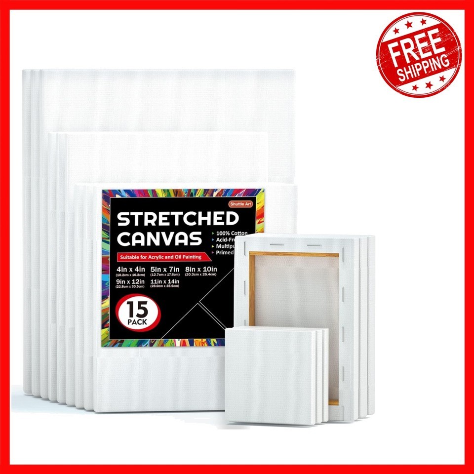 Discover the Shuttle Art 15-Pack Canvas Set, featuring a selection of high-quality blank stretched canvases in varied sizes including 4x4, 5x7, 8x10, 9x12, and 11x14 inches?perfect for both beginners and professional artists. Crafted from 100% cotton with a smooth, primed surface, these canvases allow for seamless blending and painting. The sturdy frames ensure your artwork remains taut and flat, suitable for multiple media types such as oil, acrylic, tempera, gouache, and watercolor. Conforming to ASTM-D4236 standards, they are non-toxic and acid-free, making them ideal for all ages and skill levels. Your satisfaction is our priority?feel free to contact us with any questions or concerns.