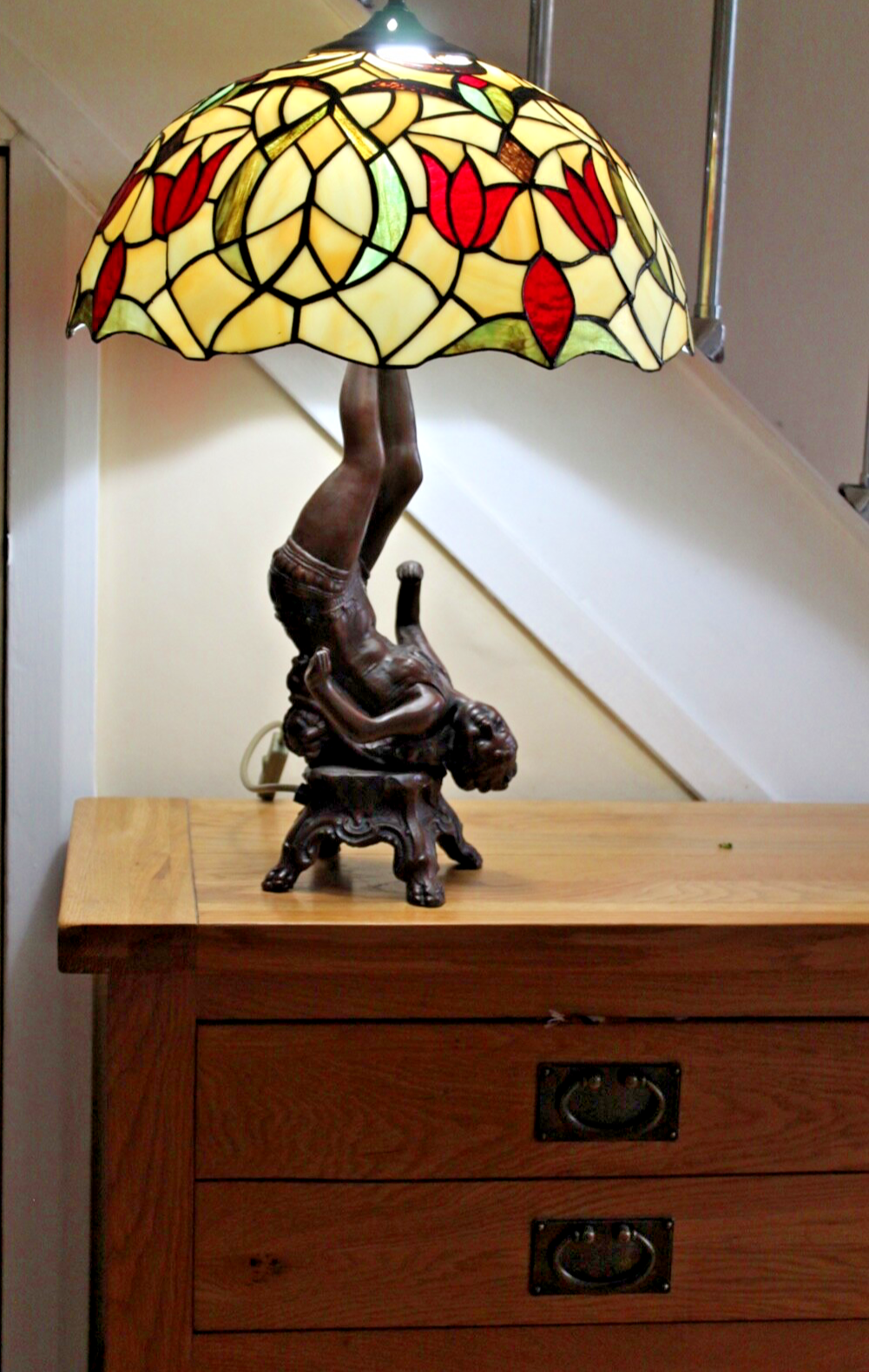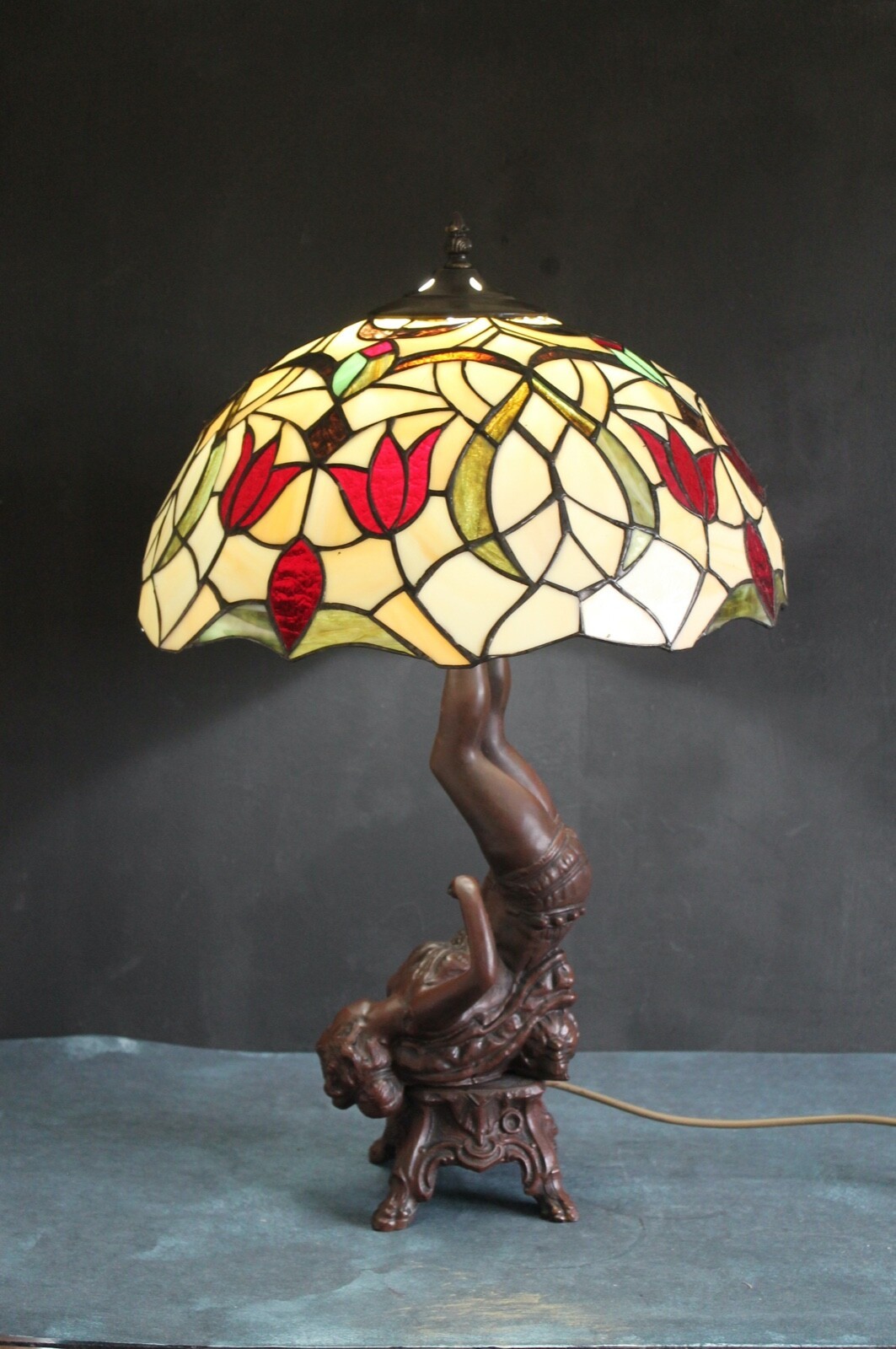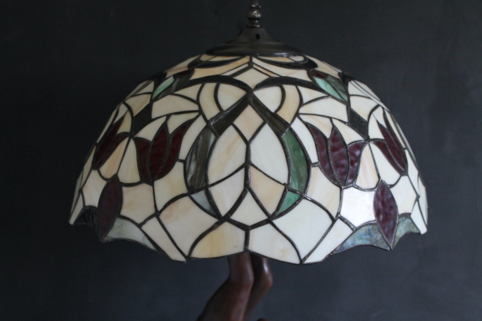 An impressive Tiffany style lamp featuring a heavy bronze base depicting a young lady in an acrobatic pose mounted on a stool.