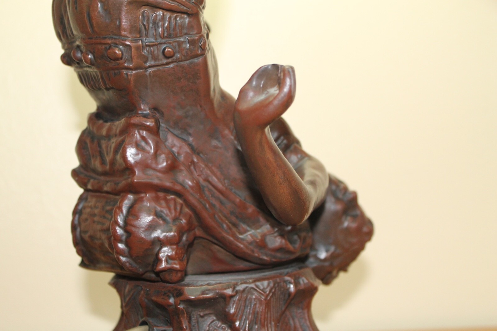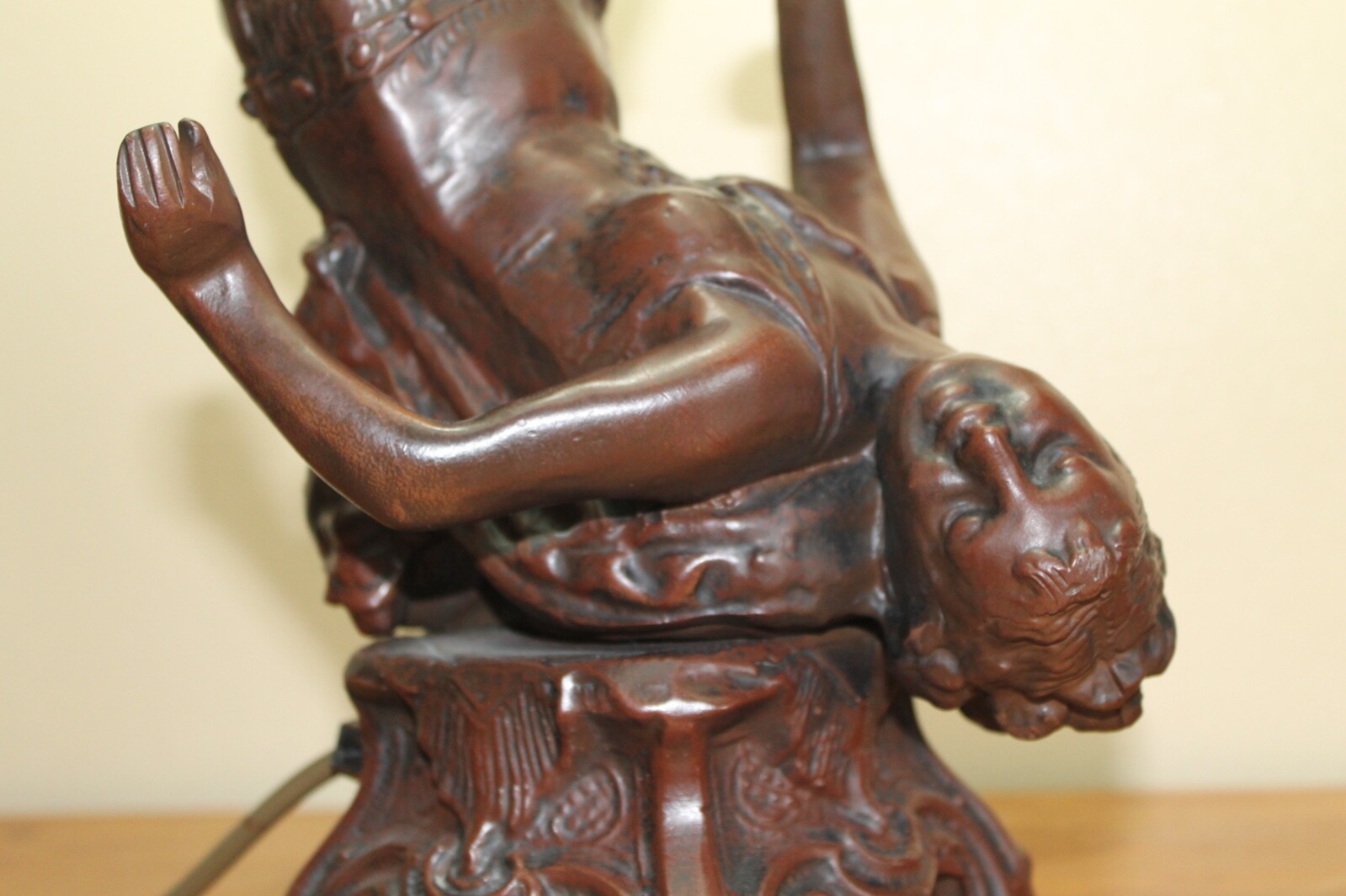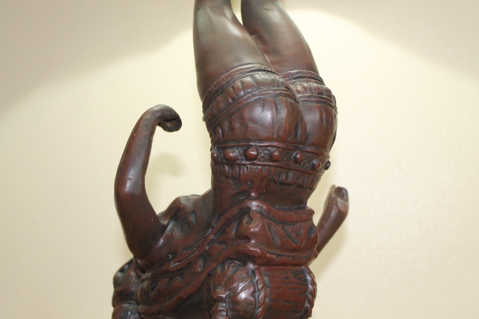 An impressive Tiffany style lamp featuring a heavy bronze base depicting a young lady in an acrobatic pose mounted on a stool.