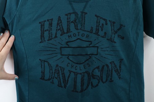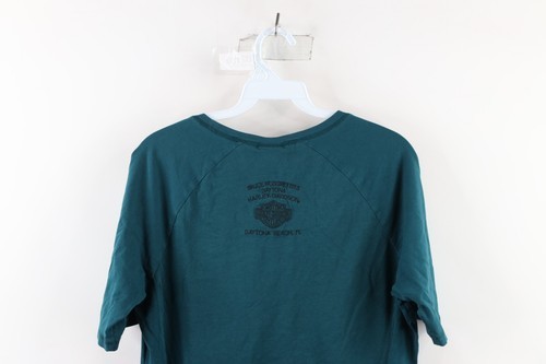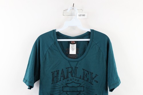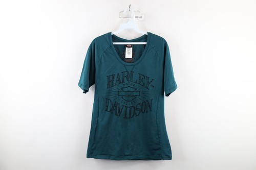 Y2K Harley Davidson Womens Large Distressed Spell Out Big Logo T-Shirt Teal