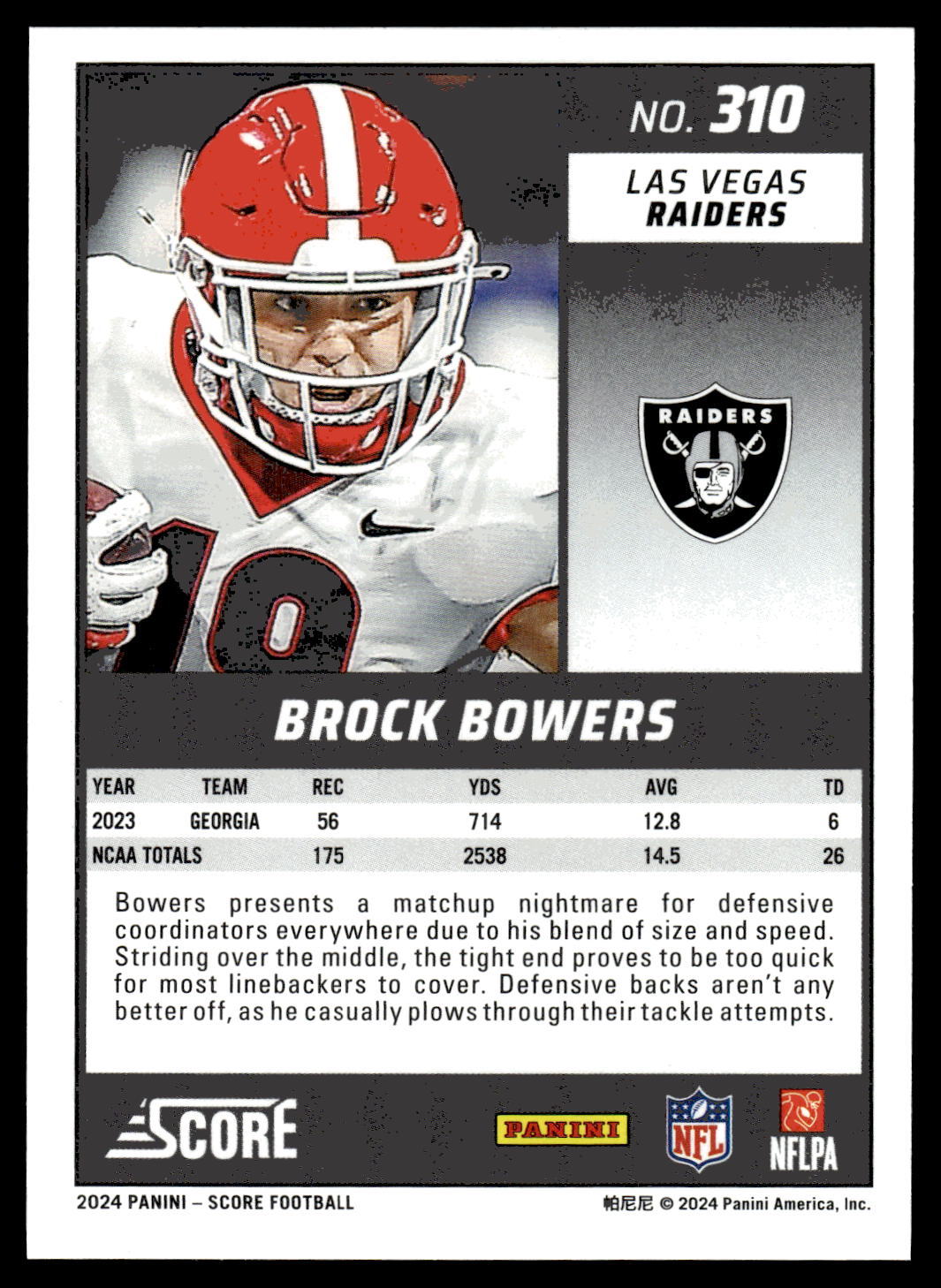 Brock Bowers RC 2024 Score Football #310 Las and 50 similar items