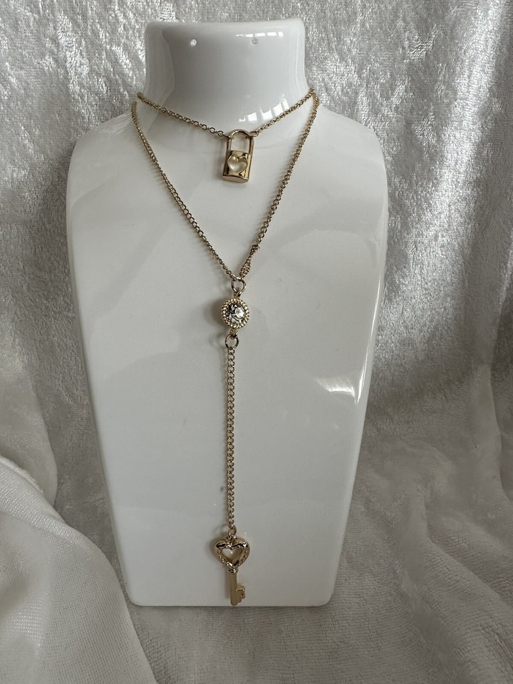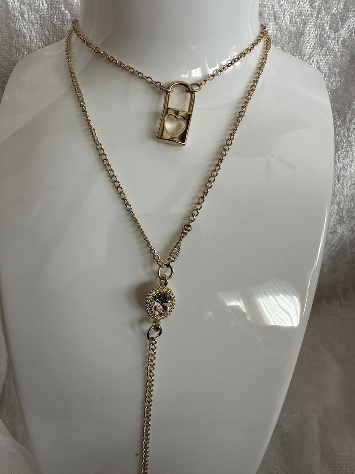 Lariat Y Station Necklace Gold Tone 28" Heart Key Crystal